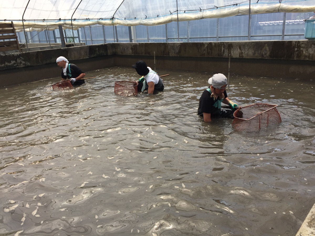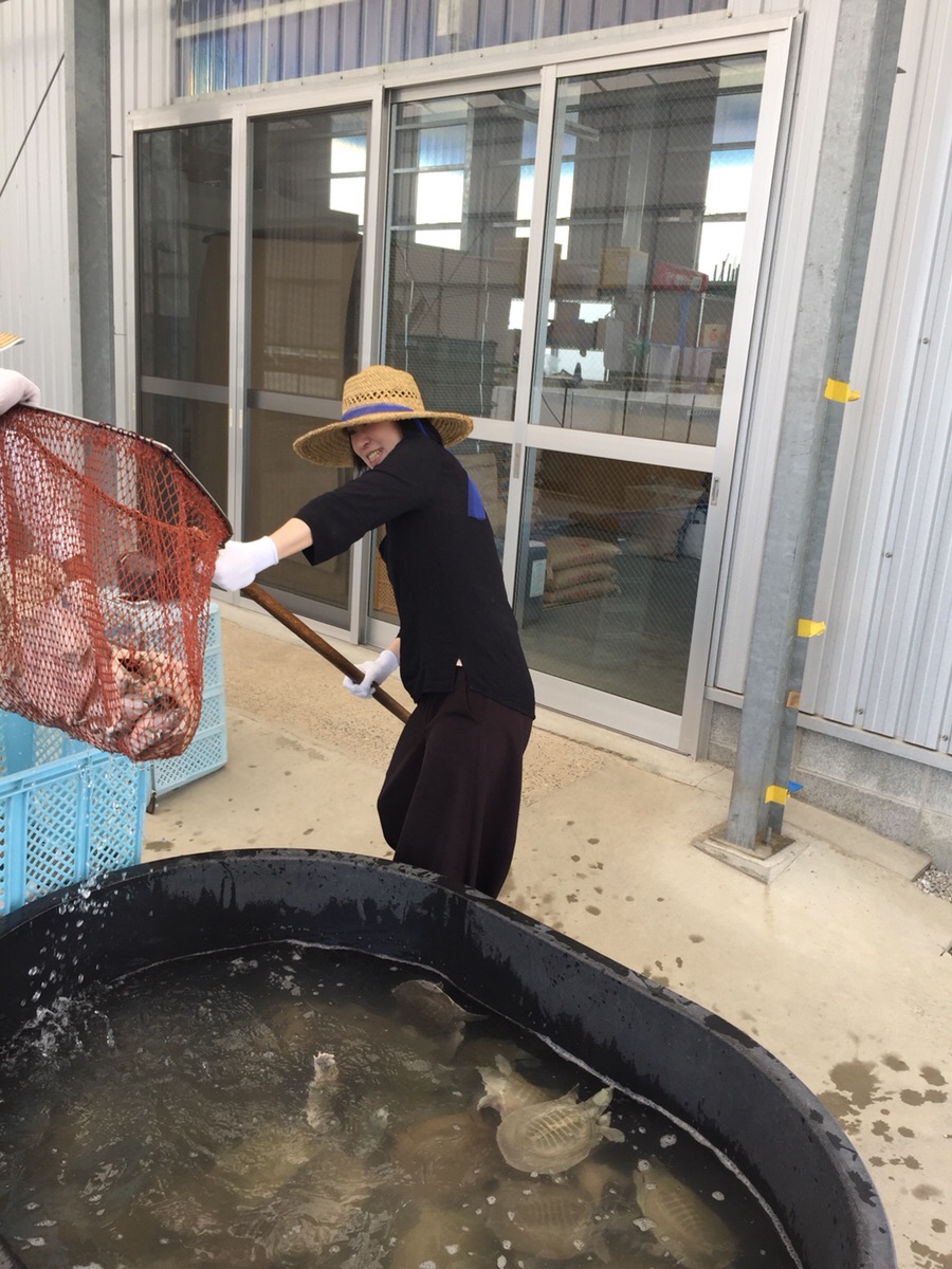この日はハウス内のすっぽんをサイズ別に選別する為に、約2000匹のすっぽんを1匹ずつ捕まえて、外のいけすにお引越しさせます。4月といえどもハウス内の温度は40℃超え・・この作業がノンストップで3~4時間続きます。大変な作業を目の当たりし、スタッフの皆さまに改めて感謝の気持ちでいっぱいになりました!