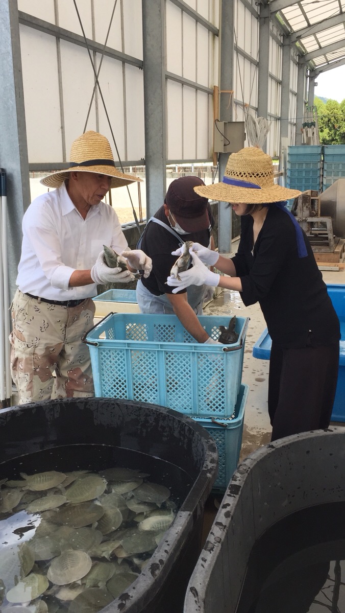 会長とお揃いの麦わら帽子をかぶり、仕分けスタート!小さいのは500g未満のものから大きいのは1kgとサイズはバラバラ。赤ちゃんと同じで、すっぽんも1匹1匹それぞれ成長する速さが違うんですね。みんな大きく成長してね~(^^)/