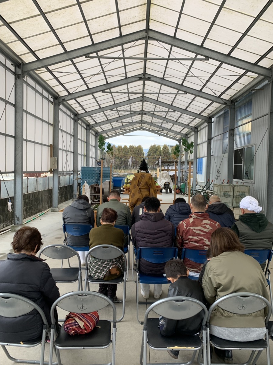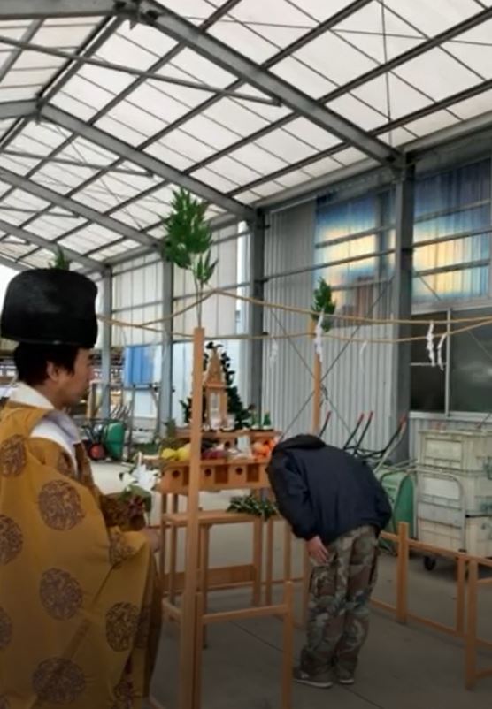 朝8時半頃から、朝鵜家とスタッフの皆さん全員揃って祈願が始まります。宮司さんより玉串奉奠を受け取り、順番に二礼二拍手一礼をしていきます。ご覧頂いているのは朝鵜会長です。会長の姿を見て、スッポンに対する溢れるほどの愛情の深さが伝わってまいり、改めて大切に育てられたスッポンを使わせて頂けている事に感謝の気持ちでいっぱいになりました。