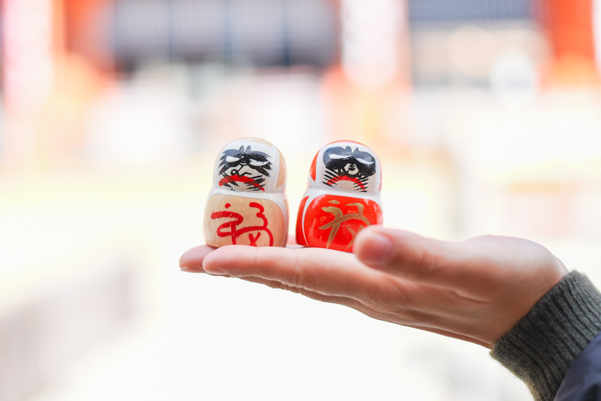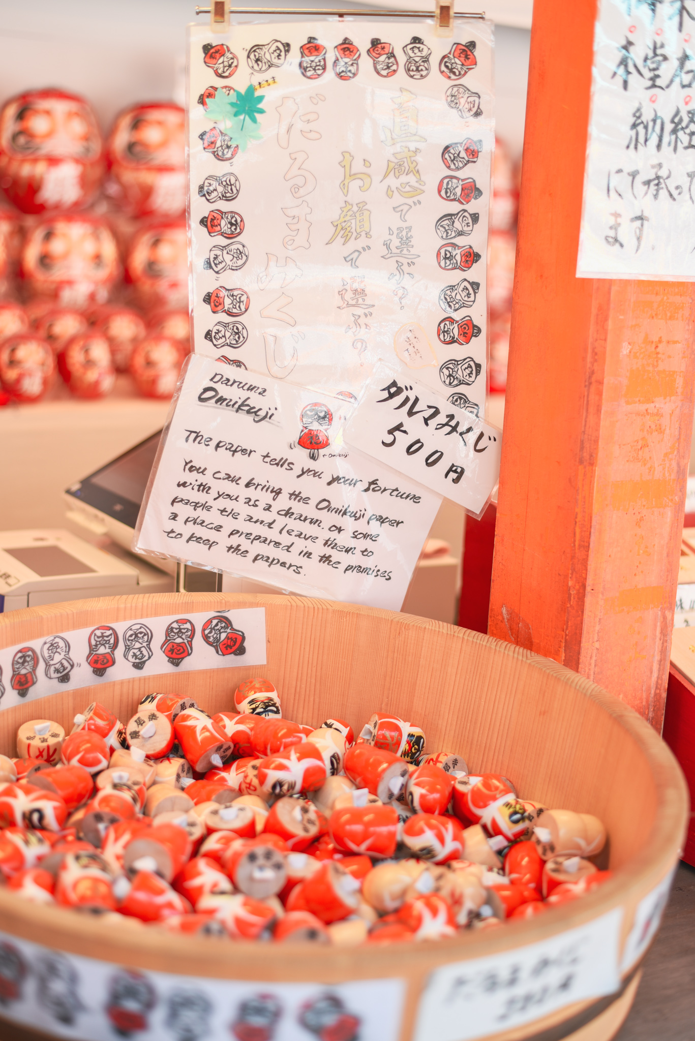 参拝した後は“ダルマみくじ”に挑戦!!ダルマにおみくじが入れ込んであります。境内のいたるところに並んでいたダルマは、このおみくじだったのですね!