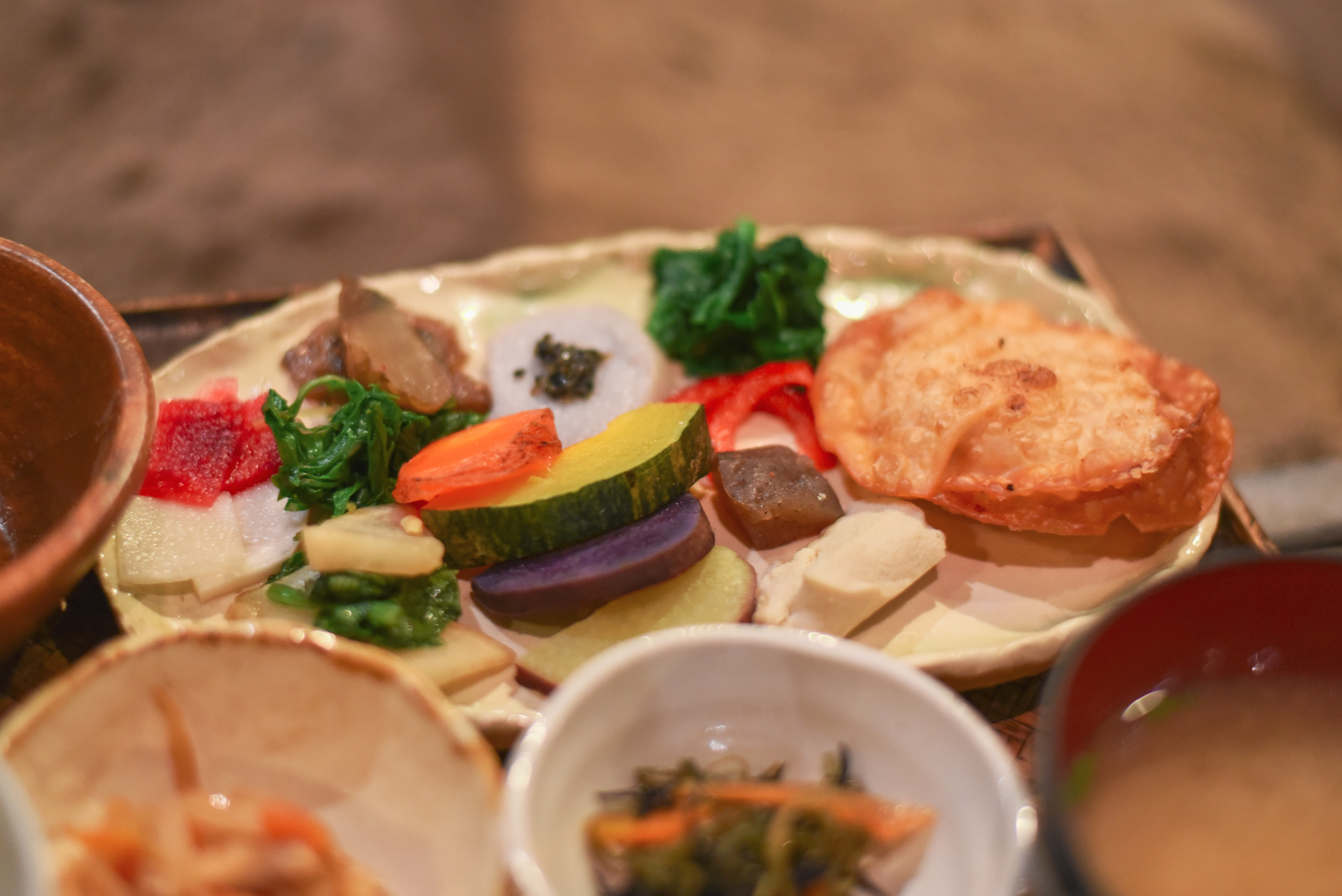 切干大根、こんにゃく、カブ、パプリカ、サトイモにカボチャなどなど。色鮮やかな旬のお野菜が並びます。驚いたのはこんなに鮮やかなのに、どのお野菜も素材のうま味がしっかり出るように味付けされていること。お野菜は地元の新鮮なお野菜を。そして味噌・塩・醤油・砂糖以外はすべて無添加にこだわっておられます。 お料理は、オーナー立花さまのお母さまが中心にされておられます。「縄文ママ」と呼んでいらっしゃるそうです(笑)