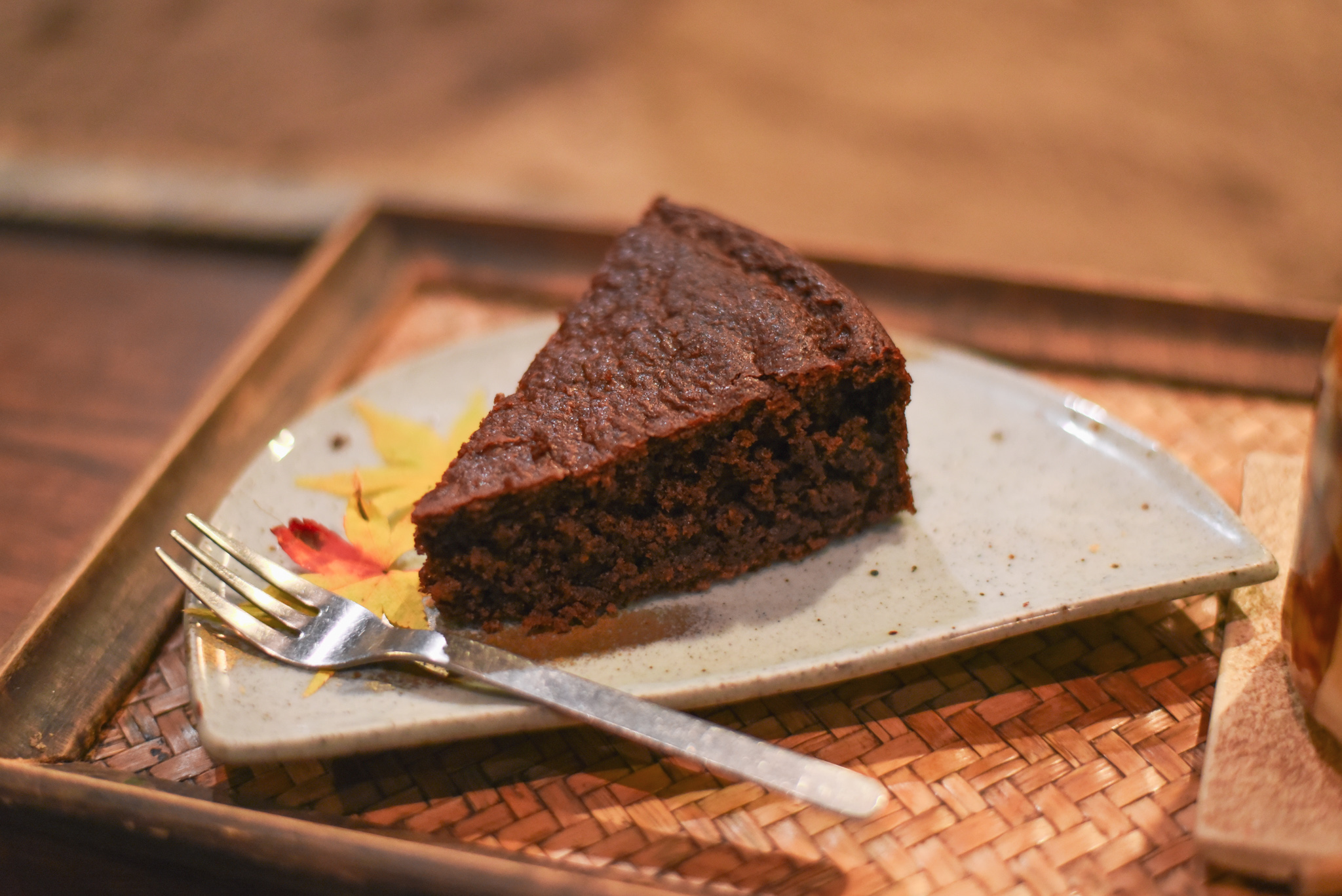 素材の味を楽しんだ後は、毎度ながら食いしん坊の私たち。しっかりデザートもいただきます。 池田は、その名も『幸運ココア』というケーキを。豆乳、豆腐をベースに北海道産の国産小麦粉にカカオやヘーゼルナッツを使用しており、さらに乳製品、白砂糖は不使用とのこと!からだが喜ぶ、優しいお味のケーキでした☆