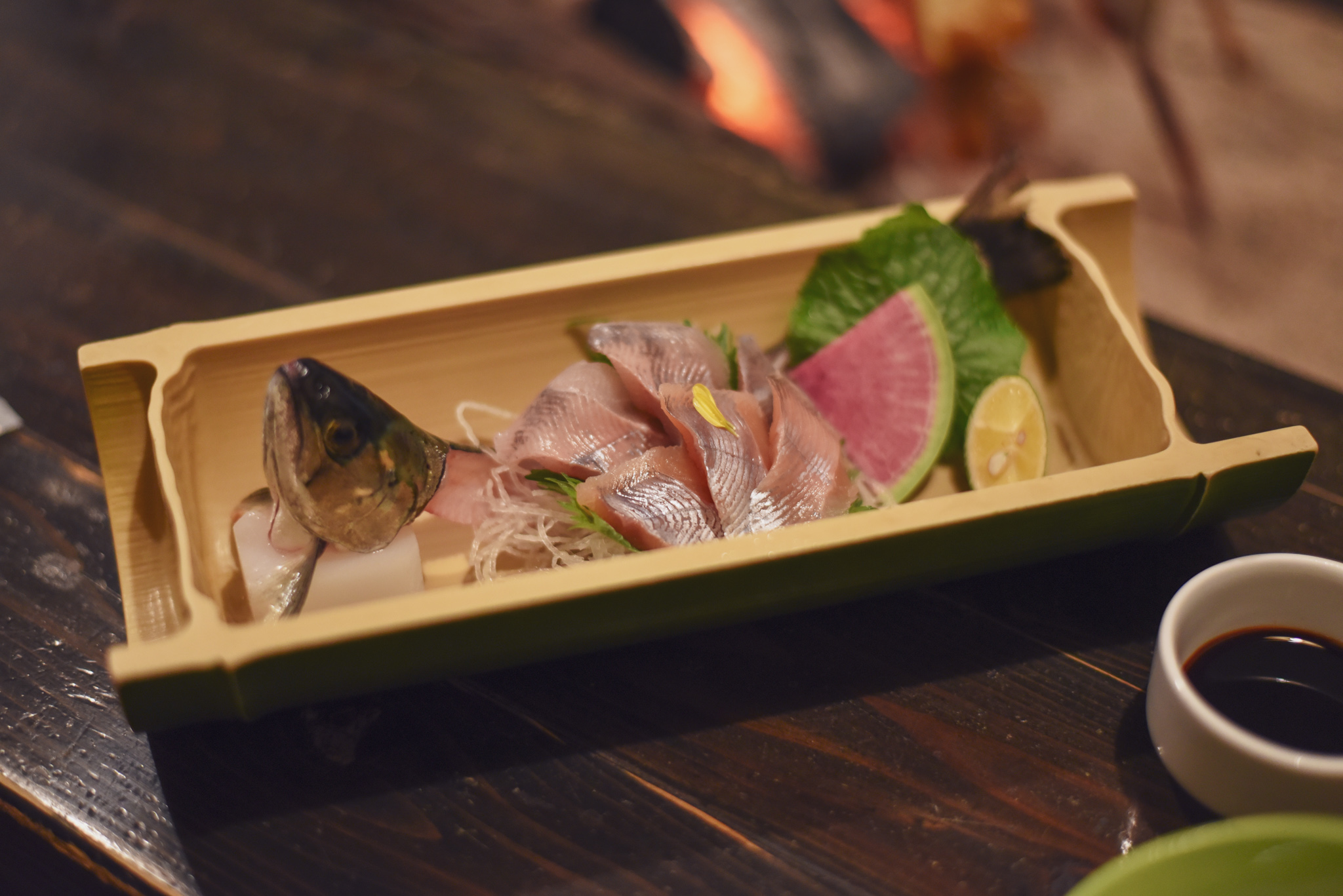 お腹がペコペコだったので、夕食を早い時間にしていただき、早速会場へ!こちらは個室♪お部屋には囲炉裏が!!ぽかぽか体の芯から暖まり、なんだか懐かしい香りがします(*^^*) 囲炉裏で焼いていたのは鮎と??「これは何ですか?」とお世話してくださった片岡さまに聞いたところ「“でこまわし”という郷土料理ですよ。」と教えてくださいました。