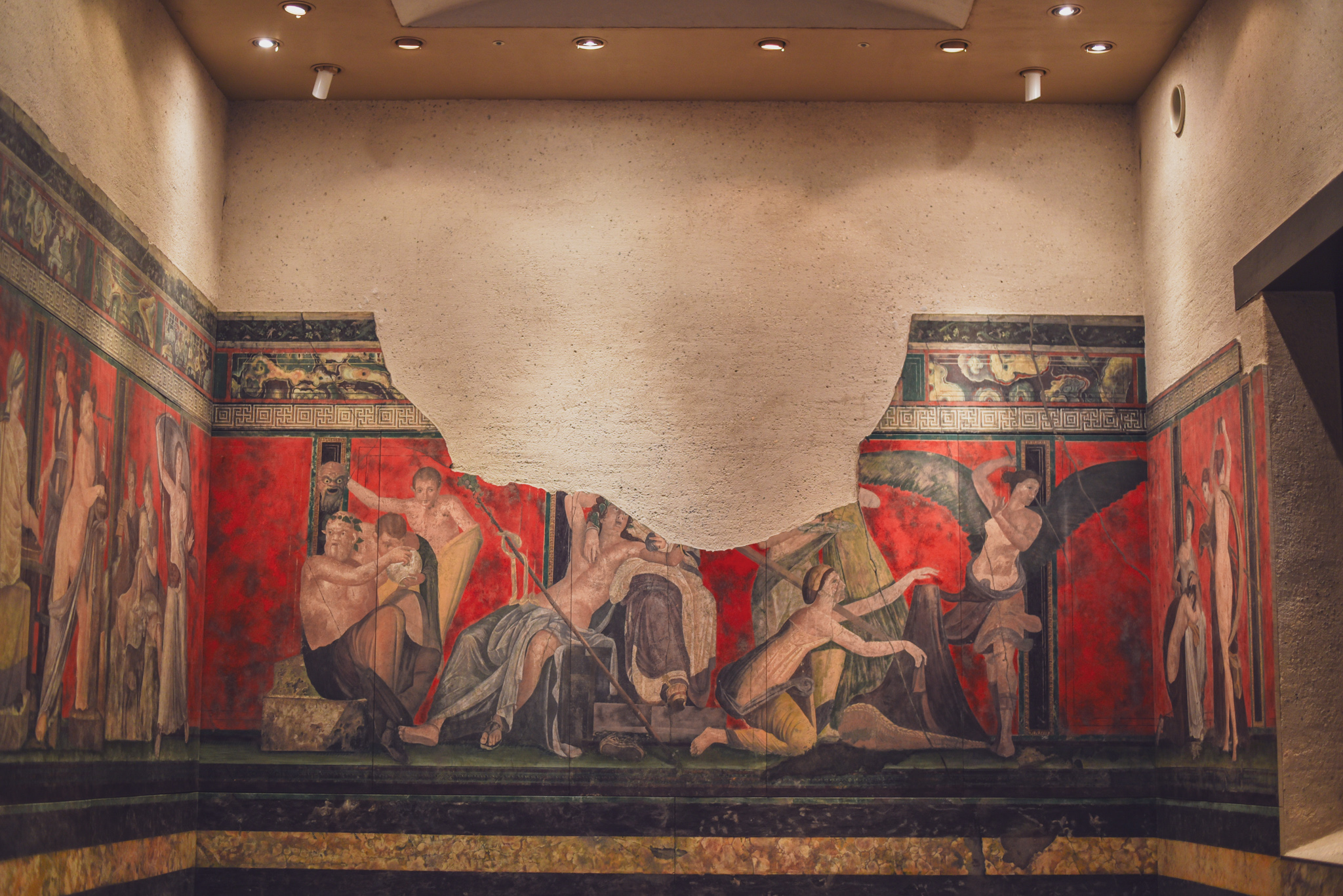 『秘儀の間』オリジナルはイタリアのポンペイにあります。花嫁の入信式を描いたといわれています。背景の朱色は、ポンペイアン・レッド(ポンペイの赤)と呼ばれているそうです。