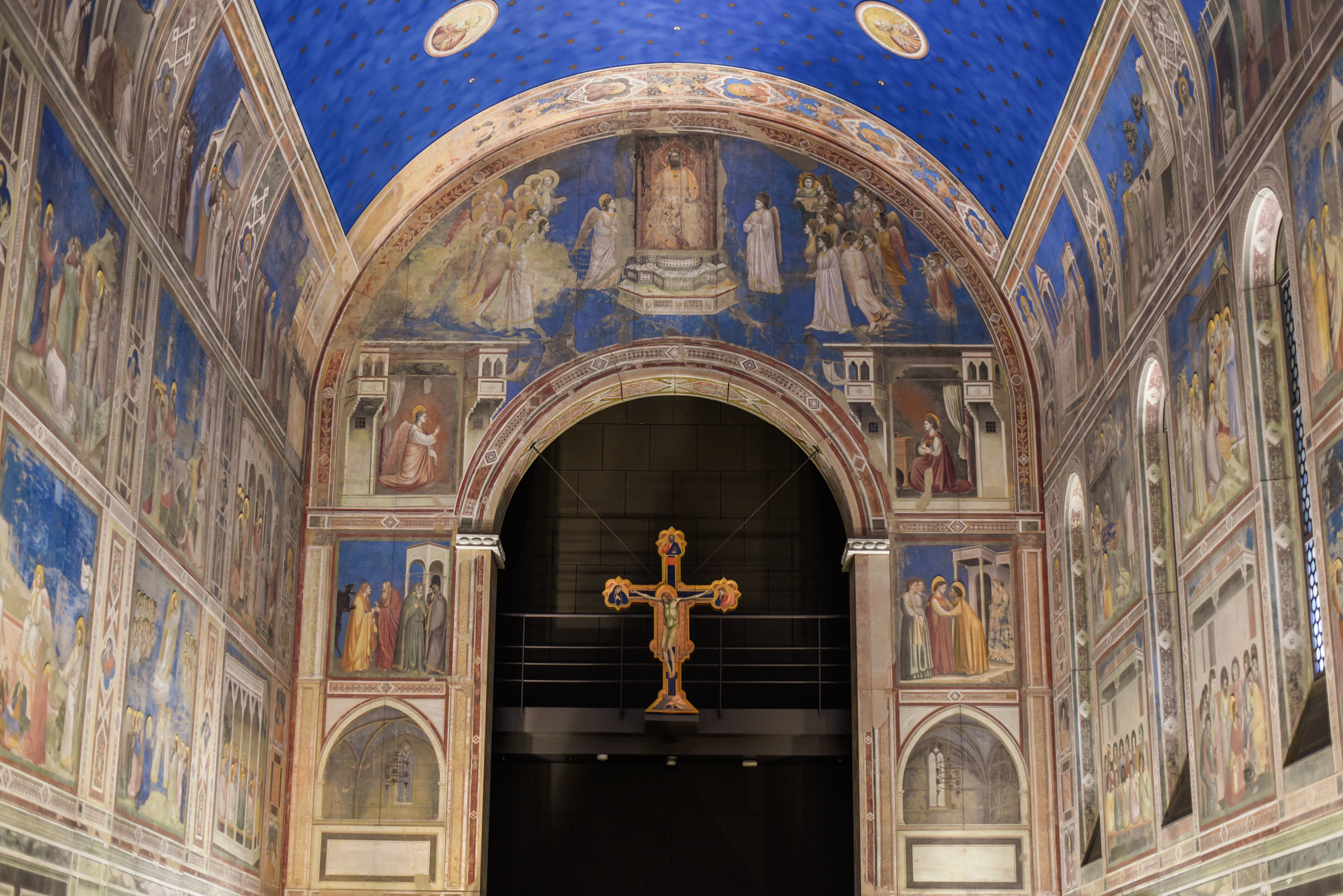 『スクロヴェーニ礼拝堂壁画』イタリアのパドヴァにあります。個人の商人が父の魂を救いたいという思いで、建てた礼拝堂の壁画を空間ごと再現しています。左右の壁面に「聖母マリアの生涯」と「イエスの生涯」が描かれており、キレイな青色は聖母マリアの青色ともいわれ、マリアブルーとも呼ばれています。