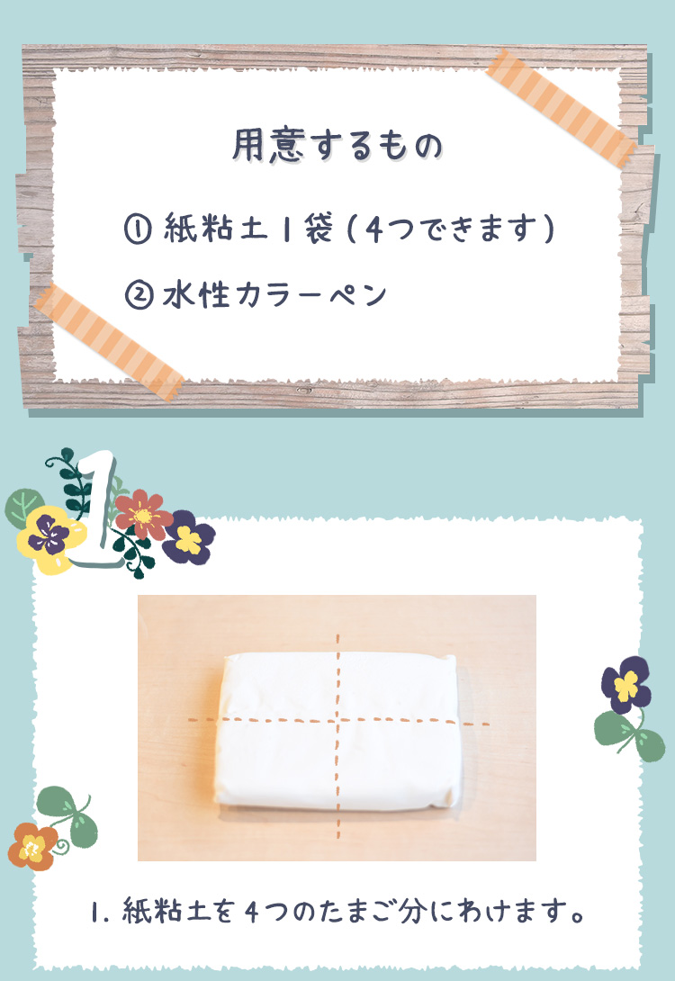 イースターは直訳すると「復活祭」。イエス・キリストの復活を祝う日です。同時に、春の訪れを祝う春のお祭り!今回は紙粘土を使って、イースターエッグをつくってみました。