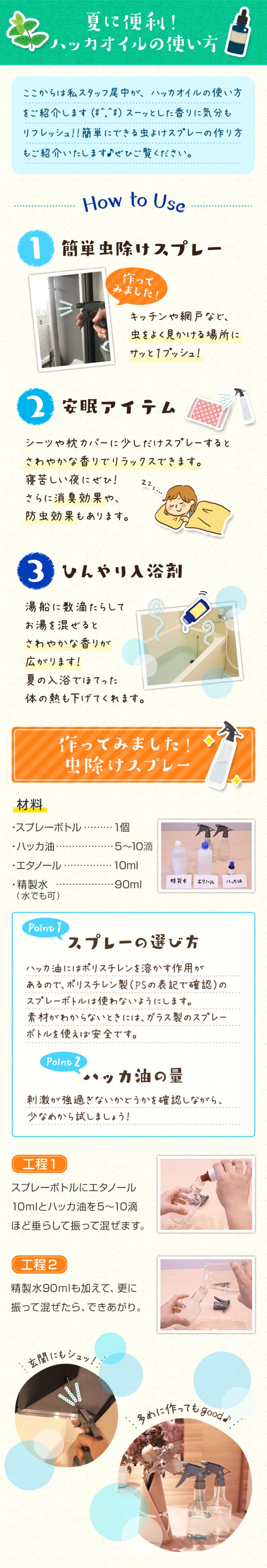 ハッカオイルはゴミ箱や排水溝、シューズボックスなど夏に気になるにおいを抑えてくれるといわれています。暑いこれからの時季、大活躍間違いなしですね!!色々な活用法のあるハッカオイル。ぜひ毎日にお役立ていただけると嬉しいです♪