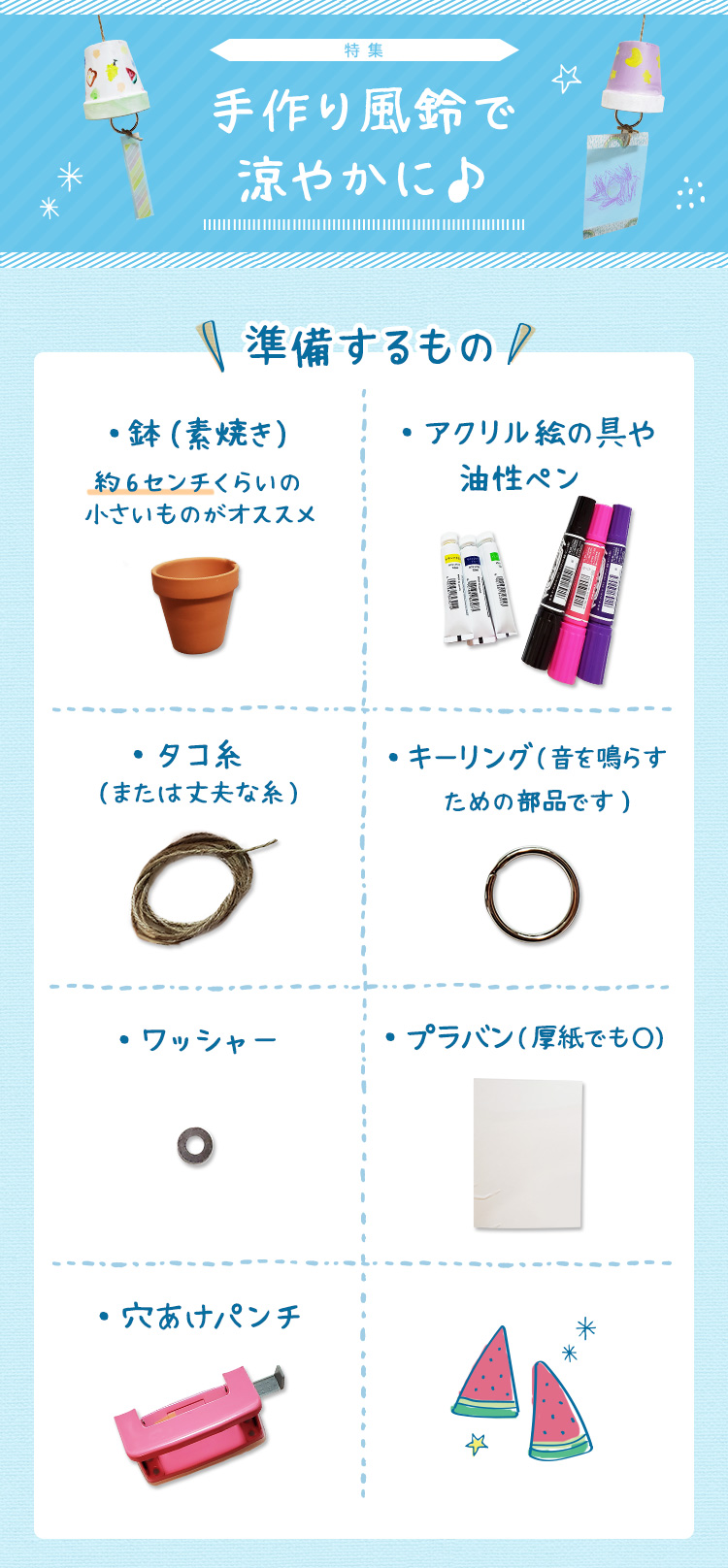 自炊することも増えて、お料理がマンネリ気味…。そんな時にご参考にしていただければと思い、今回はお家で楽しんでいただけるお料理をご紹介します♪梅雨の間も心地よい音色で癒してくれる、かんたん風鈴の作り方もご紹介!楽しい時間のお手伝いができますとうれしいです(*^^*)
