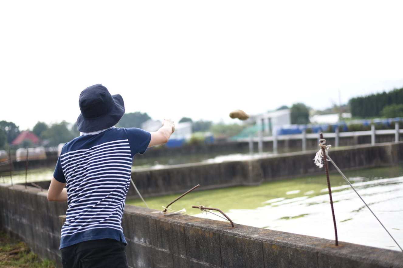 実際に生け簀へエサを投げようとすると、粘り気と重さのせいで、狙った場所に投げることができず、難しかったです。