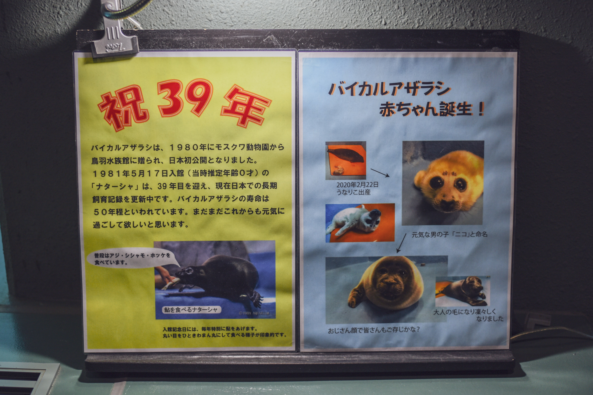 近くには、バイカルアザラシがスイスイ泳いでいます。写真は2020年の2月に産まれたおじさん顔で有名な「ニコ」くんです♪大人の毛に生え変わっていましたが、おじさん顔はなんとなく面影を残しています!こういう案内板があると、また1つ楽しく館内を回ることができますね♪