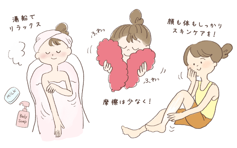 低刺激性のボディーソープや石けんを使用し、すすぎもていねいに行いましょう。 湯船に浸かると、血流が良くなり、全身をリラックスさせてくれます。ストレスも「肌のバリア機能」の低下につながるので、お風呂で心身をほぐすことは大切です。