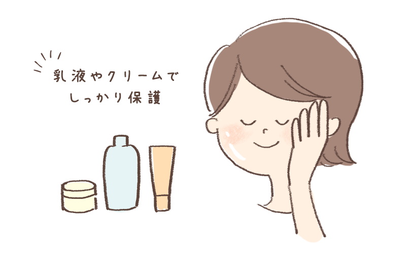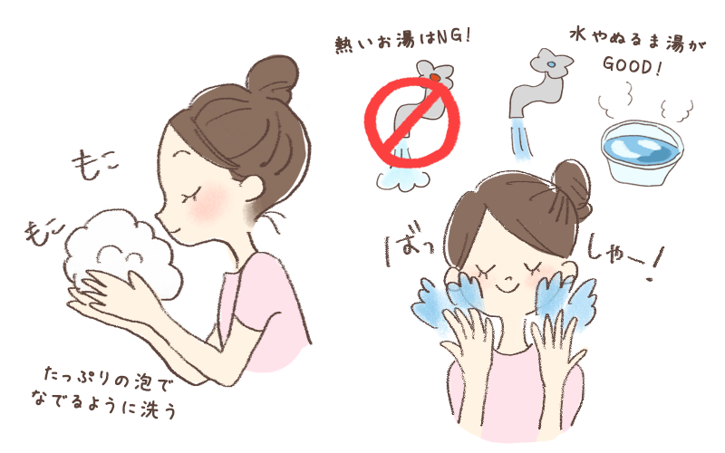 熱いお湯は肌の油分を奪ってしまうので、水やぬるま湯で洗うこともポイント。また、洗顔後は肌の水分量がどんどん減っていくので、すぐに化粧水などで保湿しましょう。 保湿のあとは、水分が蒸発しないように、乳液やクリームなどでしっかり保護することも大切です。肌の表面にフタをするようなイメージですね。