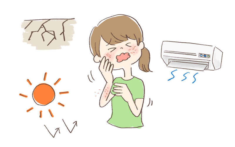 「ドライスキン」になると、肌の表面がぽろぽろとはがれ落ちたり、亀裂が入ってしまったりと、ざらついた状態になりがちです。外からの刺激に対して敏感になるので、ちょっとした刺激でもかゆみや痛みを感じやすくなってしまいます。
