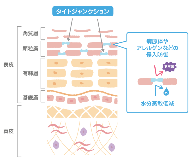 「タイトジャンクション」とは「角層」の下にある顆粒層(かりゅうそう)のバリア機能です。角層のpHを弱酸性に保ち、細胞間脂質やNMFの合成・代謝を正常に保つ効果もあるといわれています。