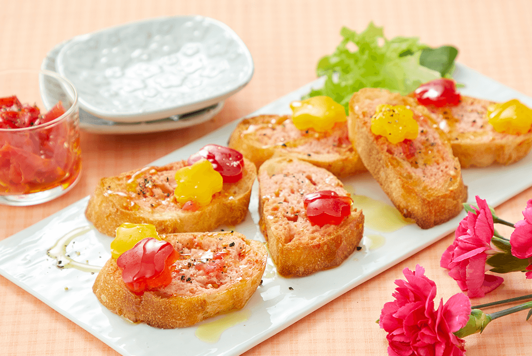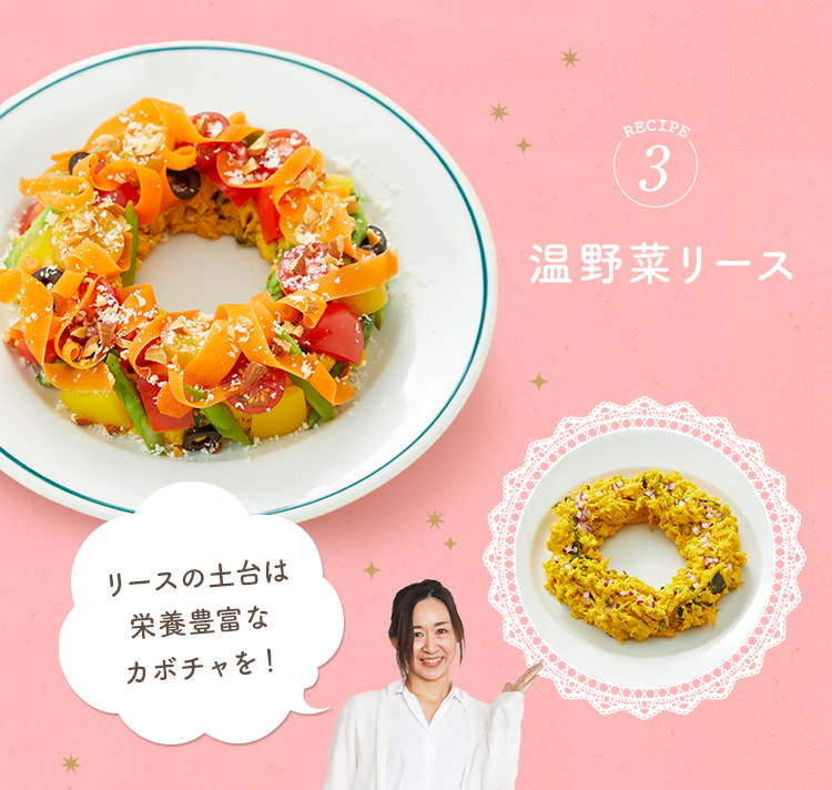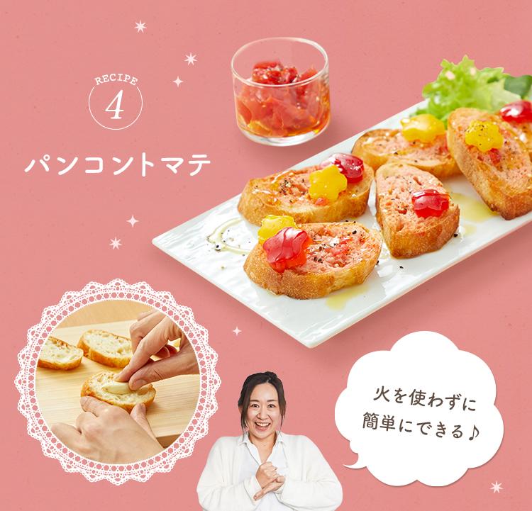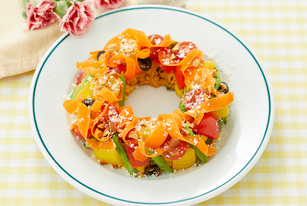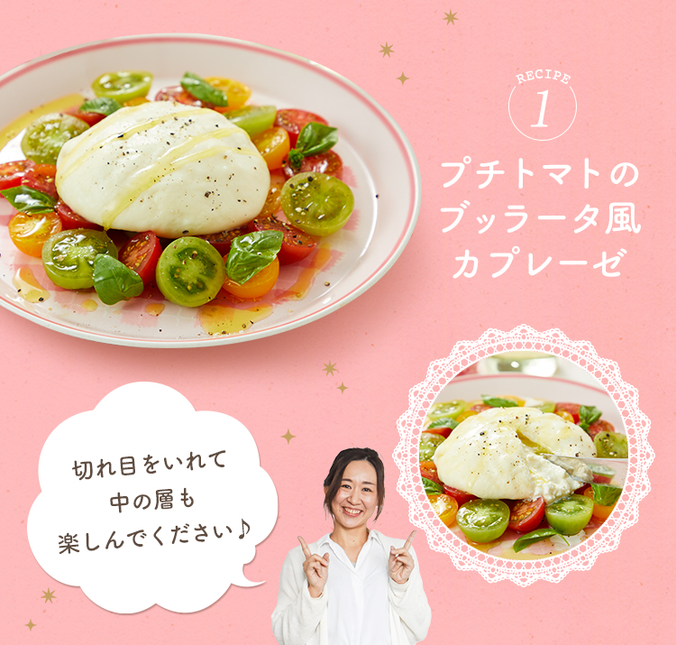 レシピ① プチトマトのブッラータ風カプレーゼ レシピ② フレッシュブーケサラダ レシピ③ 温野菜リース レシピ④ パンコントマテ