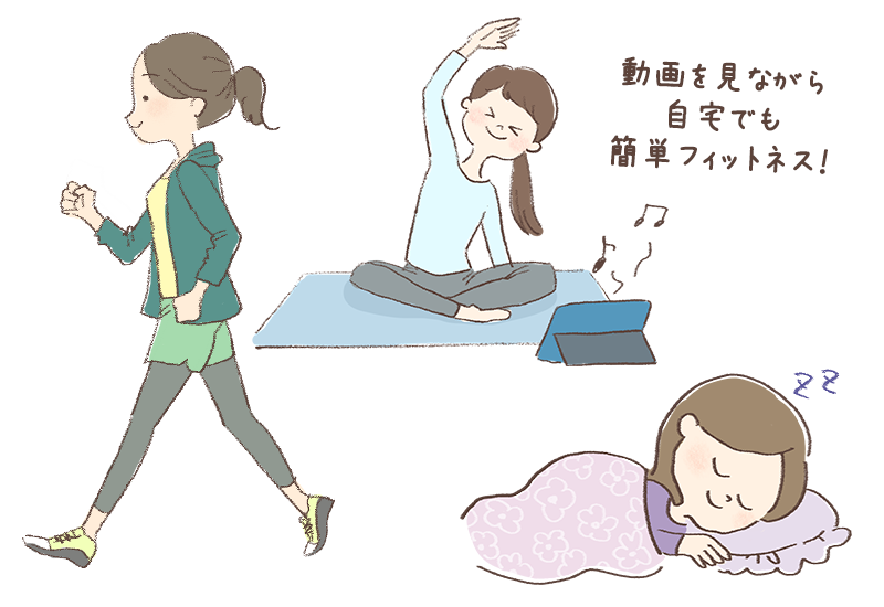 外出の際に少し遠回りして歩いてみる、エレベーターやエスカレーターではなく階段を使うなど、日常生活の中で体を動かすことを意識すると良いですよ。おうち時間が増えている今、動画を見ながらフィットネスを楽しんだり、エア縄跳びにチャレンジしたりする人も増えています。適度に体を動かすことで、睡眠の質もアップするでしょう。