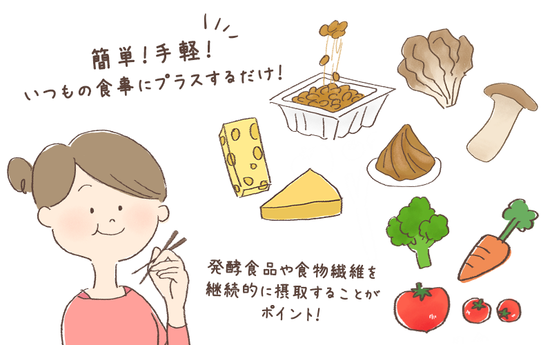 腸活を意識した食材選びのポイントは2つ。1つ目は発酵食品、2つ目は食物繊維やオリゴ糖が豊富な食品です。いつもの食事にこれらをプラスするだけでOK!