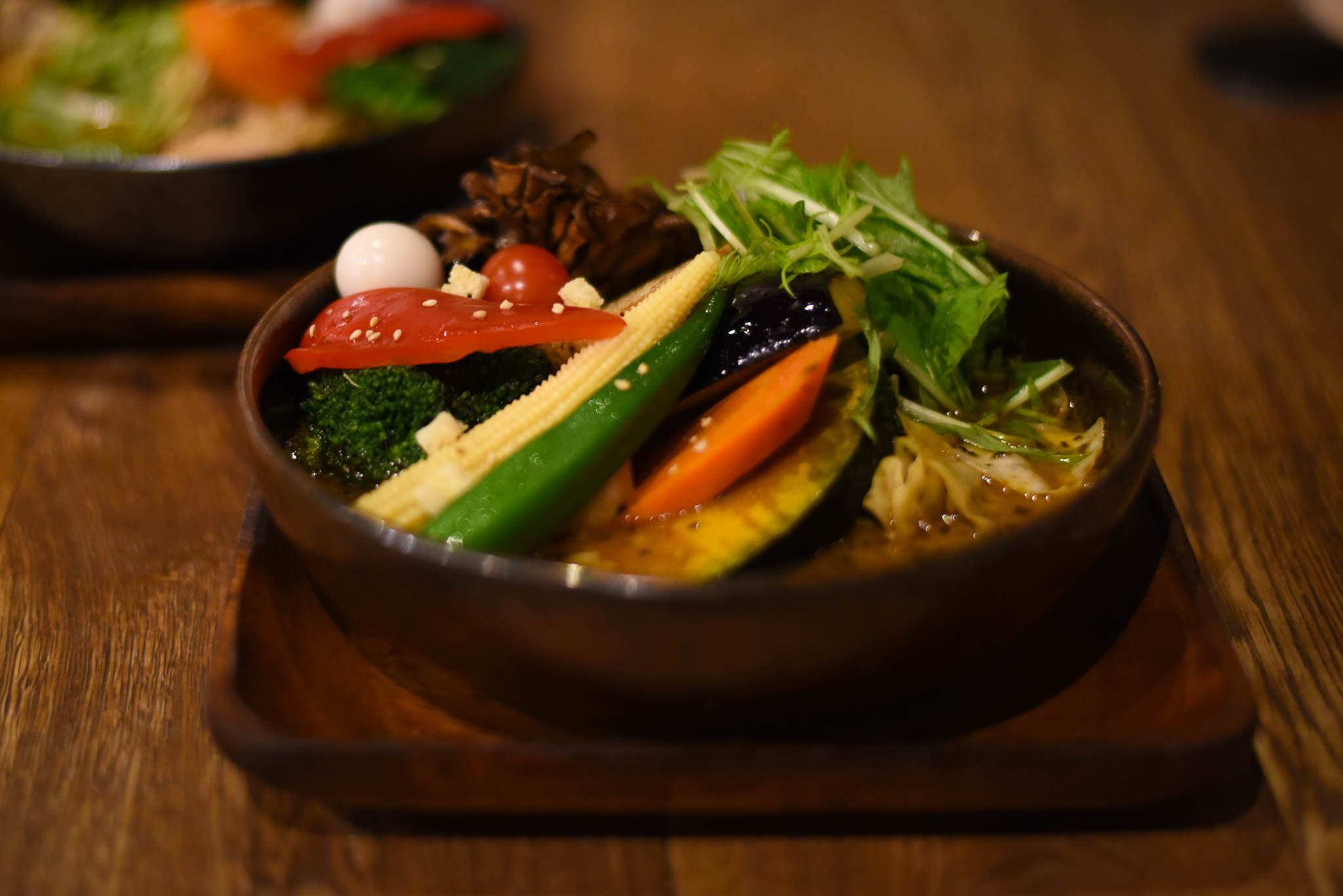 私が注文したのは『やさい15品目大地の恵』というその名の通り15品目の野菜がゴロゴロとたくさん入ったスープカレーです。色とりどりの野菜に目を奪われながら、最初の一口をいただくと…ニンジンがとっても柔らかい!ブロッコリーもスープの味がしみ込んで美味しい!!和風だしが加わった旨味たっぷりのスープは、ターメリックライスにもピッタリでした(*^^*)