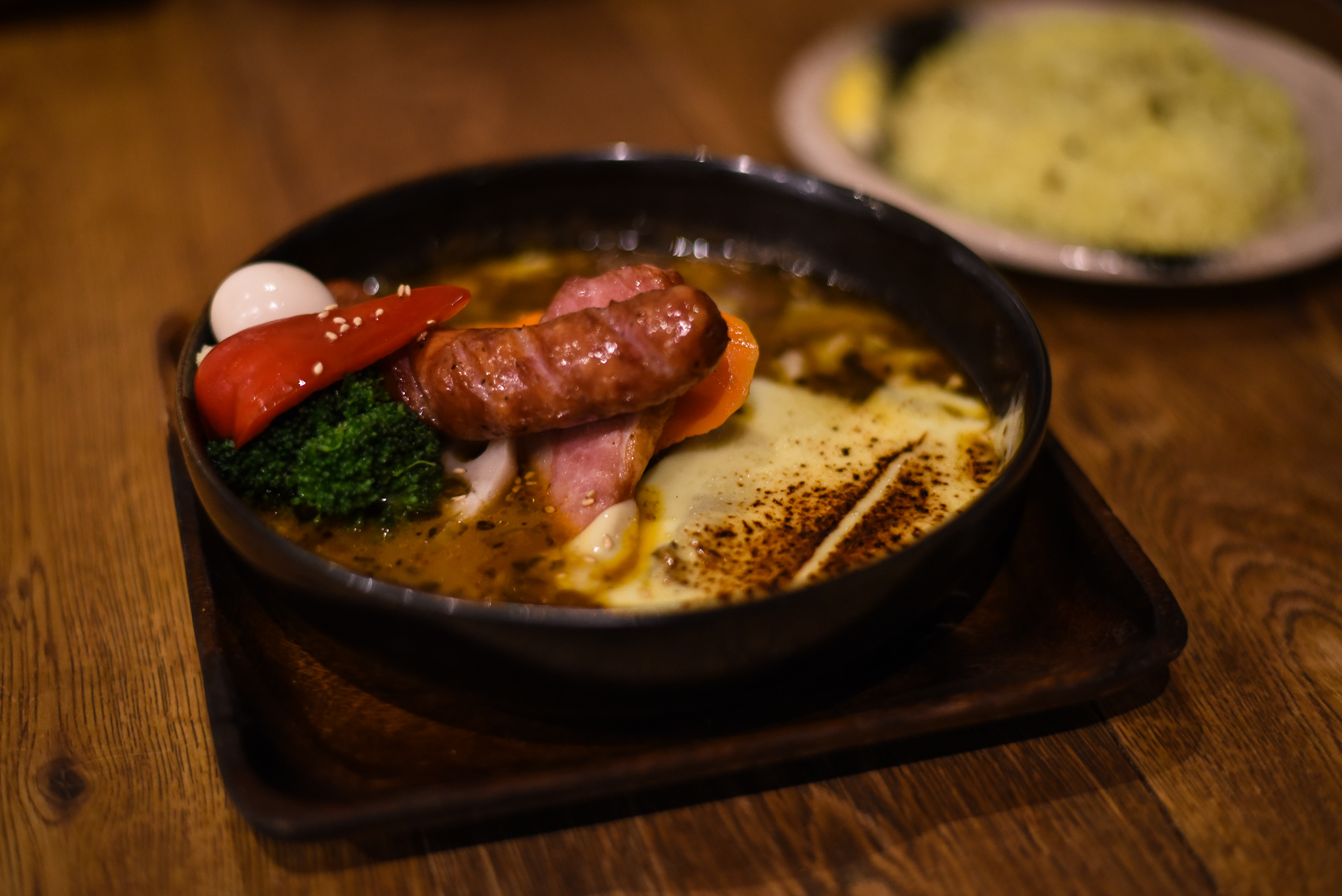 同行スタッフが食べたのは『ポークフランクとベーコンの炙りチーズのせ』。大きいウィンナーがジューシーで食欲をそそられるスープカレーです。