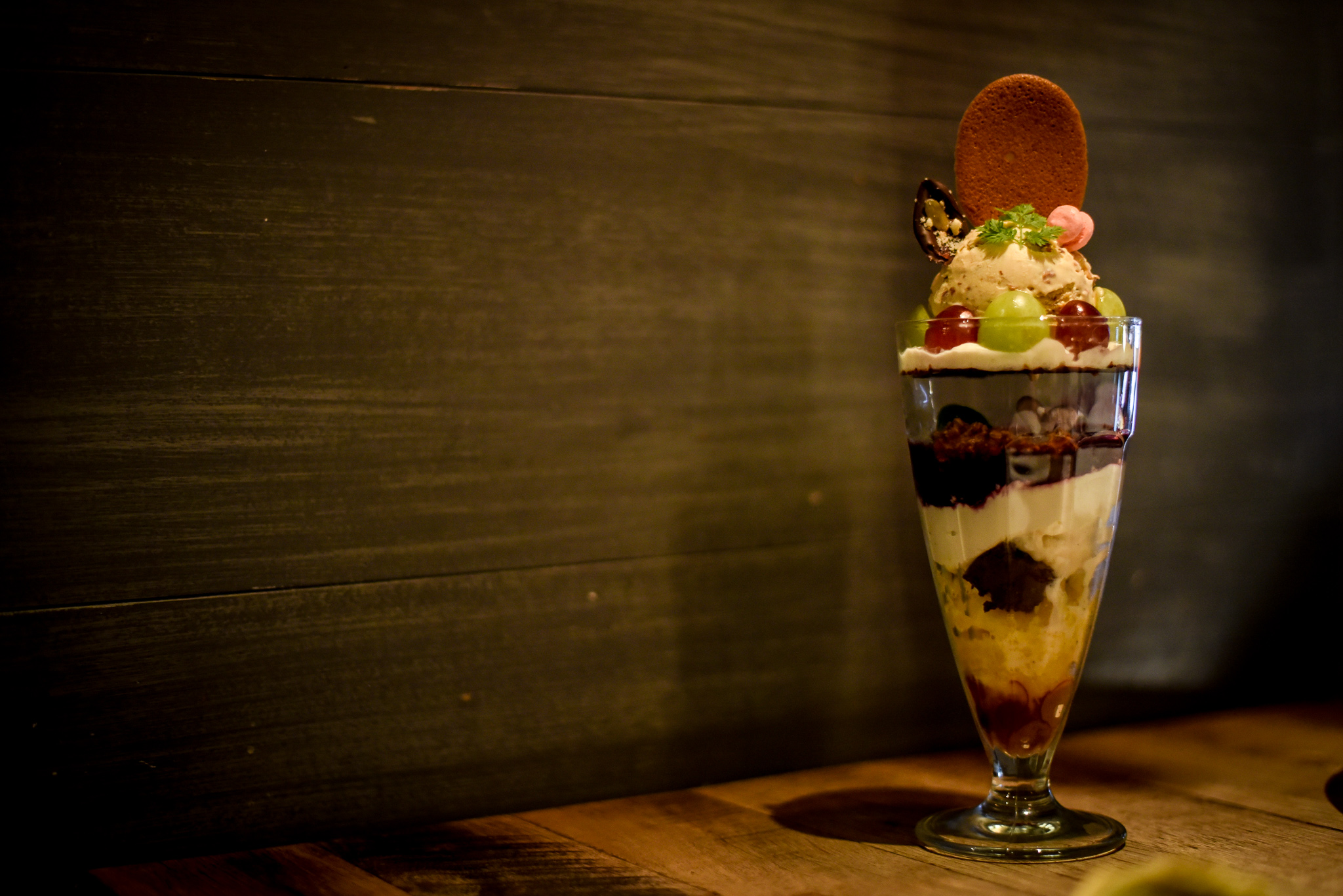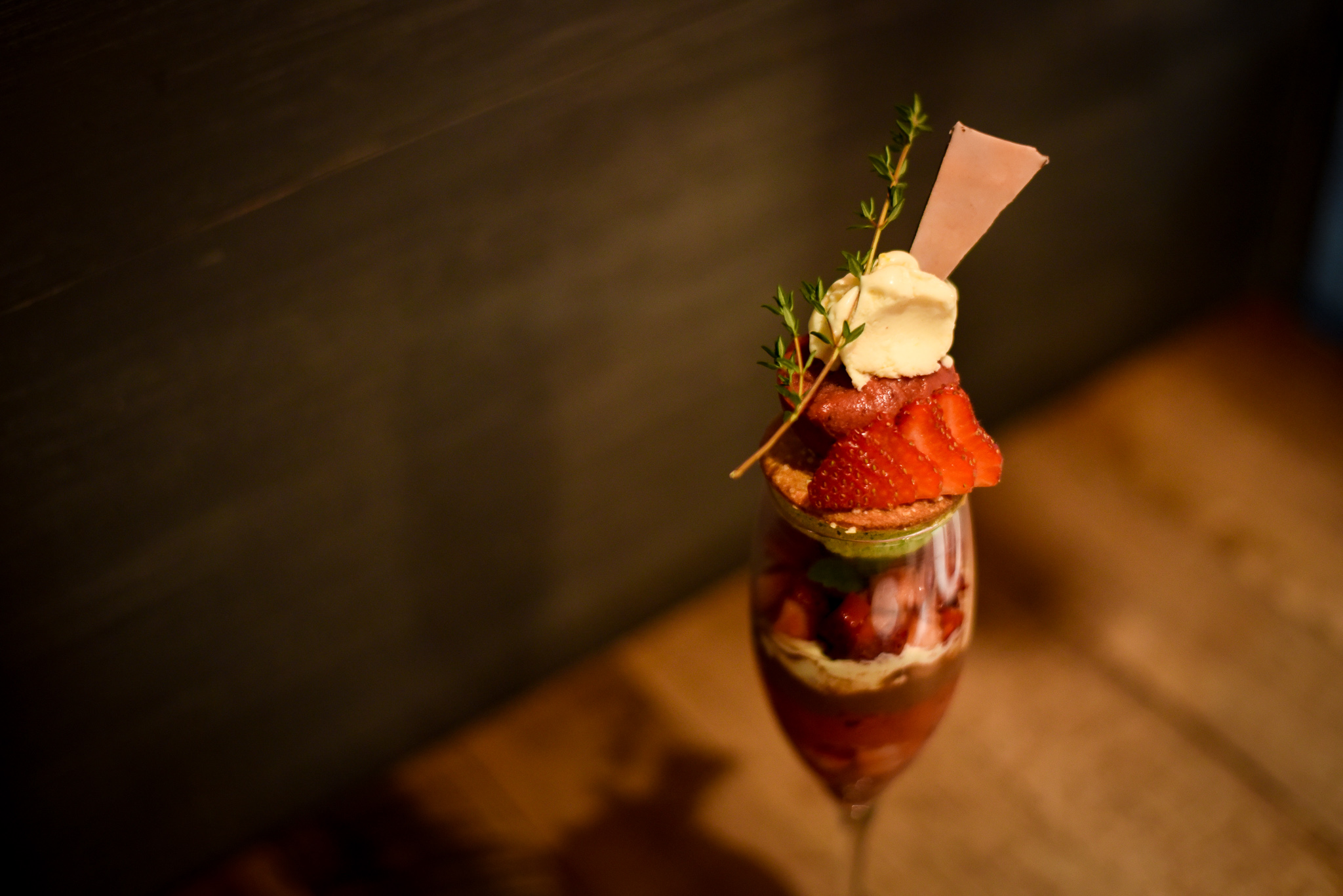 同行スタッフは“ラ・フレイズ”をいただきました。獺祭(日本酒)やオレンジ、チョコレートやカシスに加え、国産イチゴの果肉などなど、素材のブレンドを楽しめるパフェでした。組み合わせによって色々な風味を楽しめ、見た目も華やかなパフェでした。