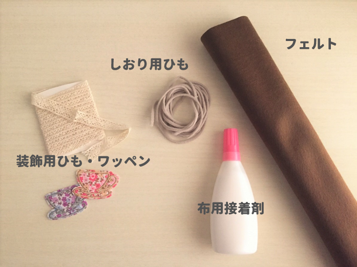 23cmの長さに切ったひもを下で玉結びし、フェルトの内側中心部に布用接着剤で貼りつけます。
