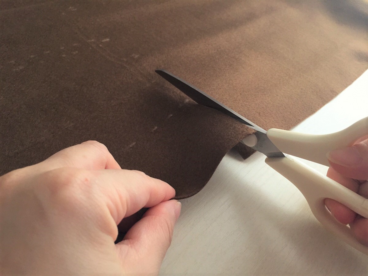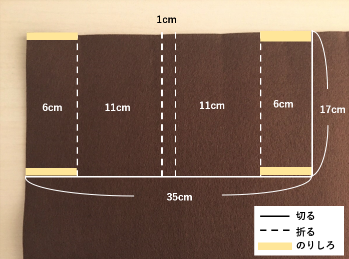 チャコペンシルで、切る線と折る線に印をつけていきます。布用接着剤を塗るのりしろの場所も作っておきましょう。