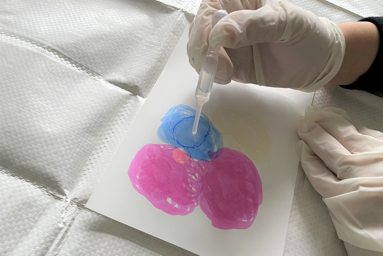 ペーパーを傾けてみたり、ドライヤーの風をあてるとアルコールが動いて模様が広がっていきます。