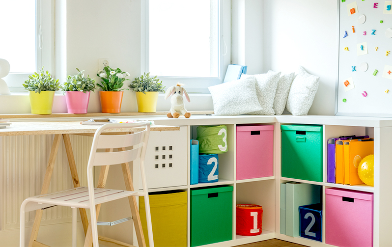 このように種類ごとにボックスを色分けすると、わかりやすいうえにお部屋もカラフルに様変わり。
