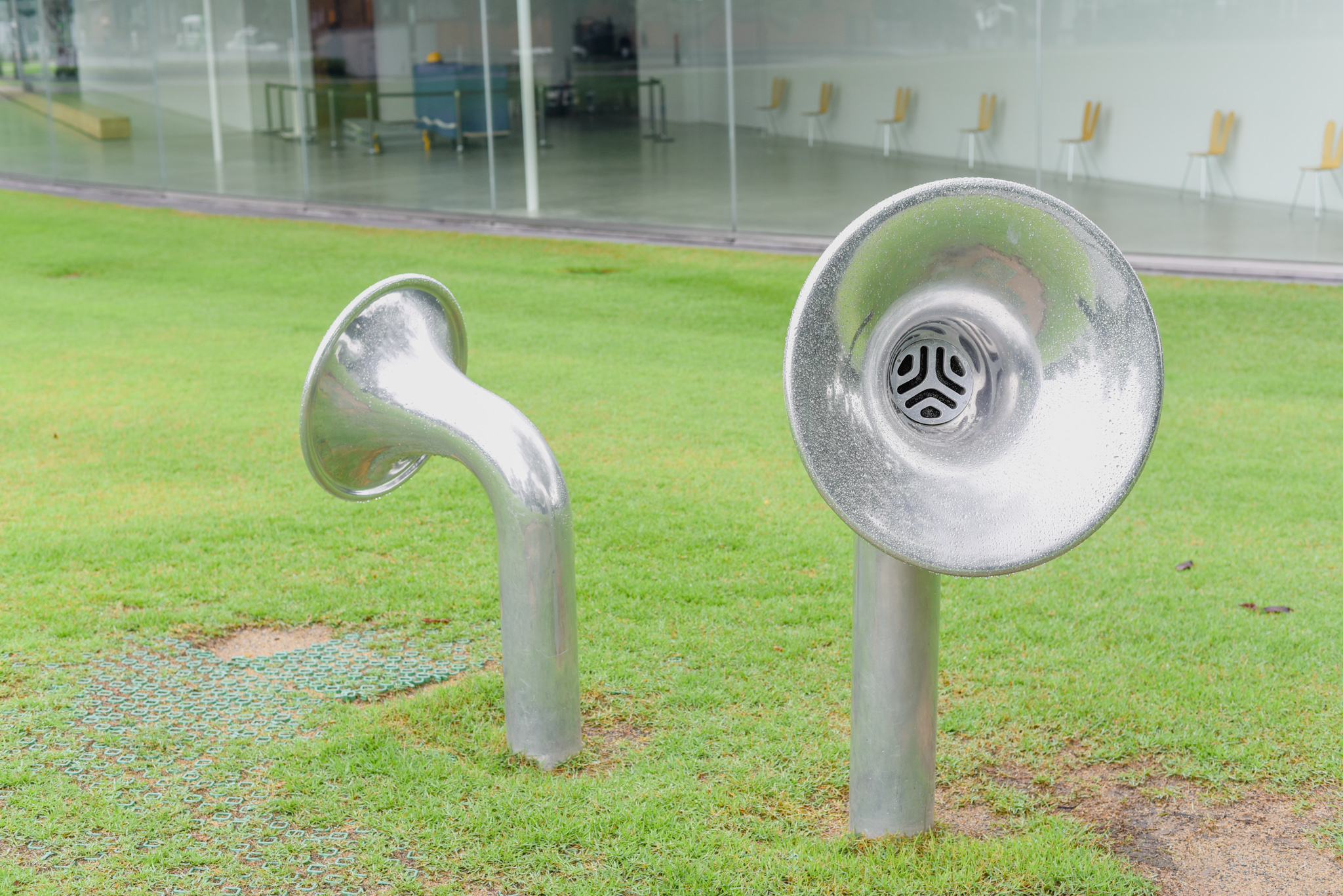 遠くのあちらにも見えます! こちらは金沢21世紀美術館の周りに12個置かれていて、地中を通る管が2個ずつペアでつながっており、伝声管の役割を果たしています。おもしろいのが、ペアは必ずしも隣同士のラッパではないところ。思わぬところへ声が伝わり、思わぬ声が聞こえてきます。まったく知らない方とついついおしゃべり…なんてこともありえますね♪