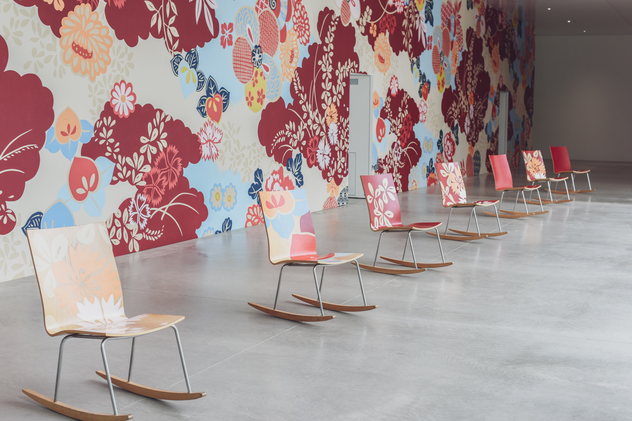 加賀友禅の古典図案をモチーフにした作品。華やかでかわいいですね!座ると向こうに見えるのは…