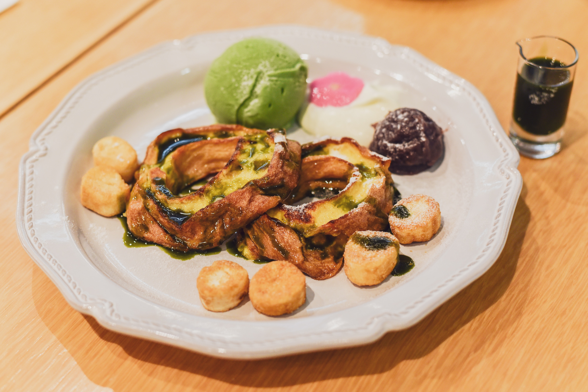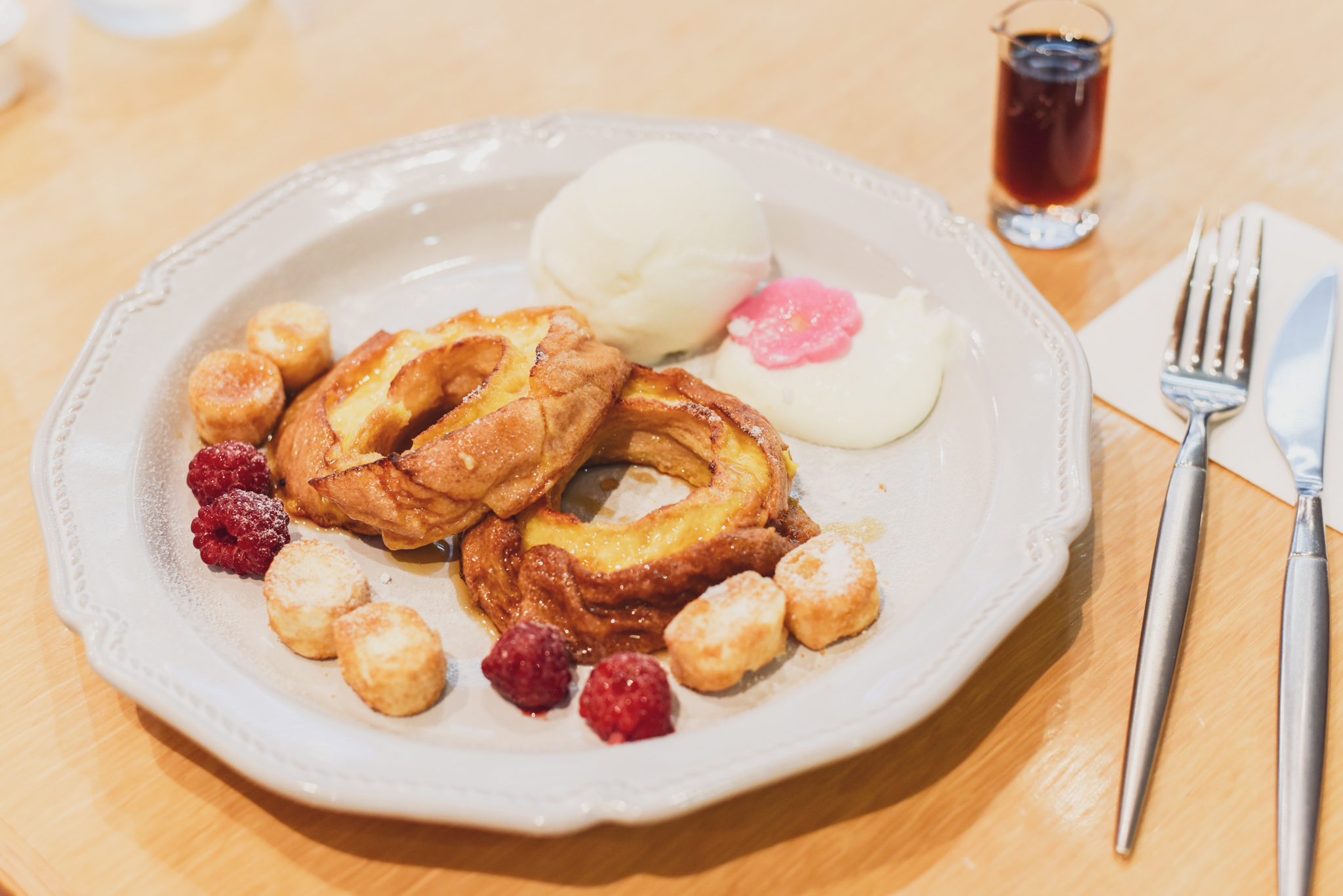 なんと!!くるま麩のフレンチトーストなんです( *´艸`) 不室屋さんで販売されている“おやつ麩”と豆乳アイス、ホイップクリーム、ラズベリーとたっぷりのメープルシロップが一緒に♪