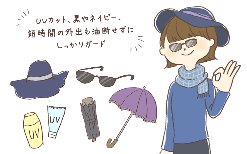 帽子や日傘は薄い色だとUVカット効果が弱くなります。黒やネイビーなど、紫外線を吸収してくれる濃い色を意識して選んでください。