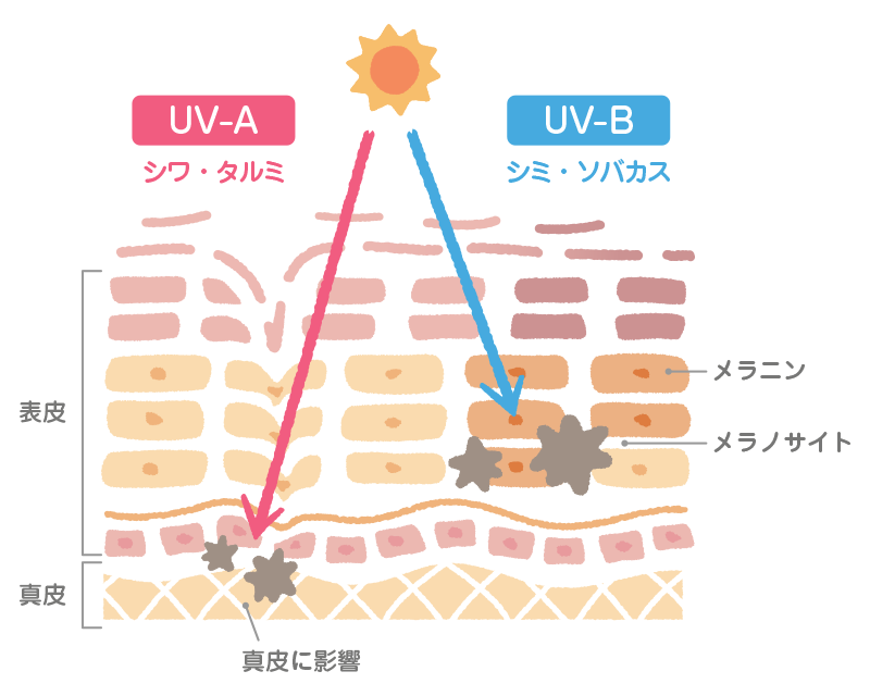 地上に降り注ぐ紫外線には「UVA波」と「UVB波」の2つがあります。UVB波は海やレジャーなどで受ける、肌を黒くしたり赤くしたりする強い波長の紫外線です。肌表面の表皮部分まで届き、強い日焼け(サンバーン)を引き起こし、おもにシミやそばかすの原因になります。