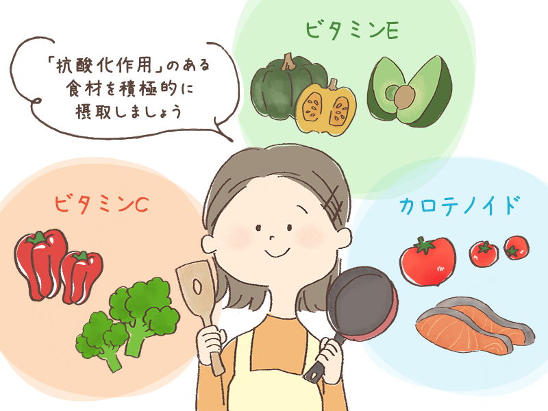 紫外線を浴びると「活性酸素」が発生します。増えすぎた活性酸素は、乾燥、シミ、シワなど肌にトラブルをもたらします。そのため、活性酸素を除去するといわれている「抗酸化作用」のある食材を積極的に摂取しましょう。