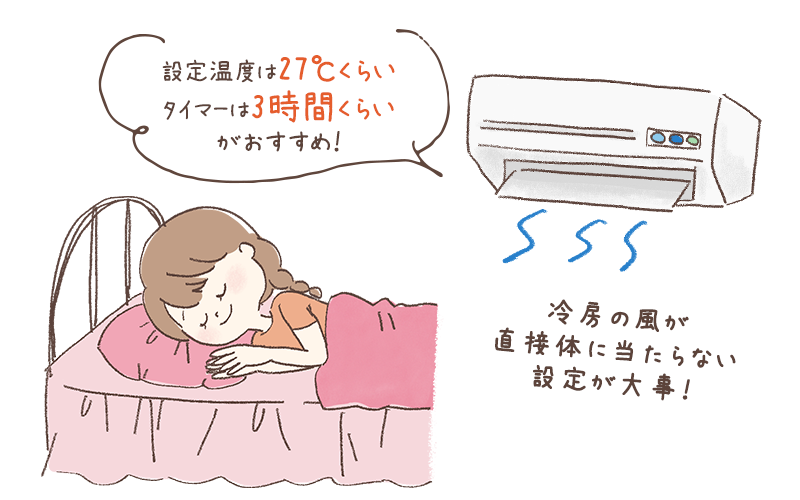 良質な睡眠を取るには、眠りに入る約3時間がとても重要です。この3時間で脳と体が休まるかが決まるといっても過言ではないくらい大切なので、その途中で暑さで目が覚めないよう、冷房のタイマーは3時間くらいに設定すると良いでしょう。