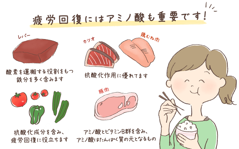 アミノ酸を摂取することで、筋肉の疲労回復や、筋肉がつきやすくなり、疲れにくい体作りに繋がります。