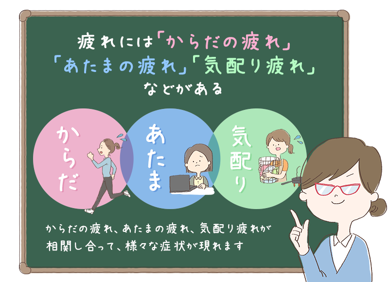 疲れには「からだの疲れ」「あたまの疲れ」「気配り疲れ」の3つがあり、それぞれに出る症状について紹介します。