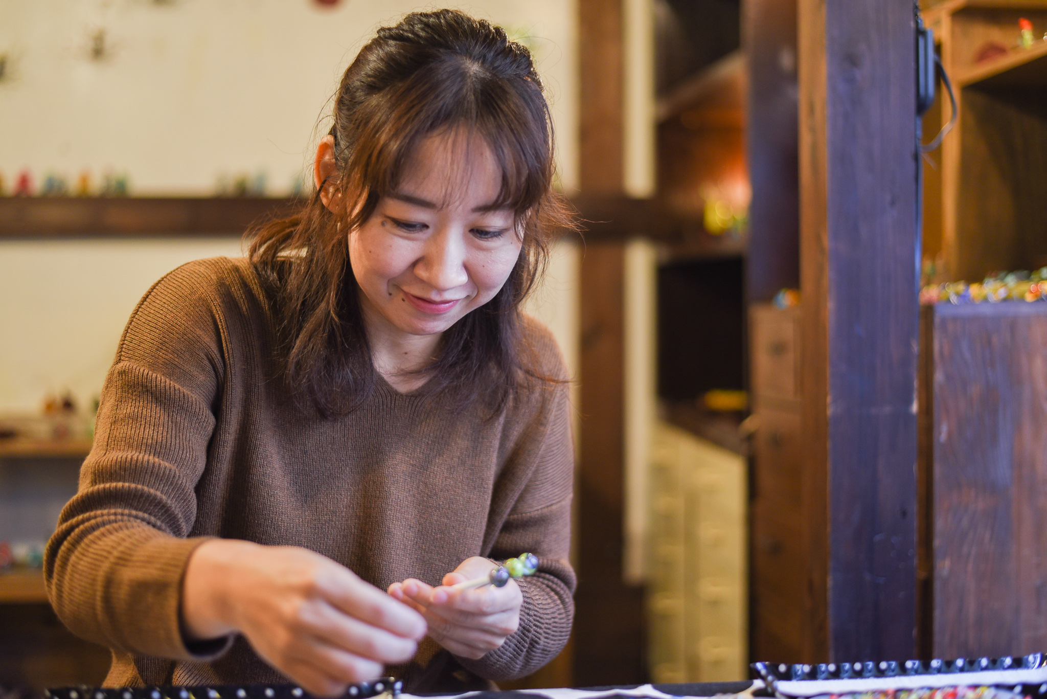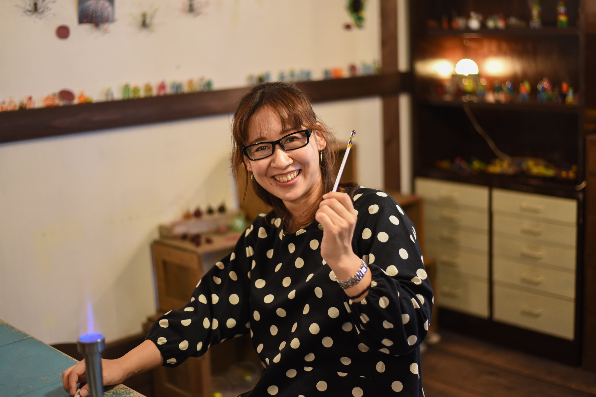 早速体験スタート!たくさんあるマドラーやティースプーンからお気に入りのものを選び、持ち手の先端に付けるガラスを5つ選びます。「たくさんあって、全然決まらへん~!」というスタッフ池田をしりめに、意外と早く決まった私尾中です(笑)