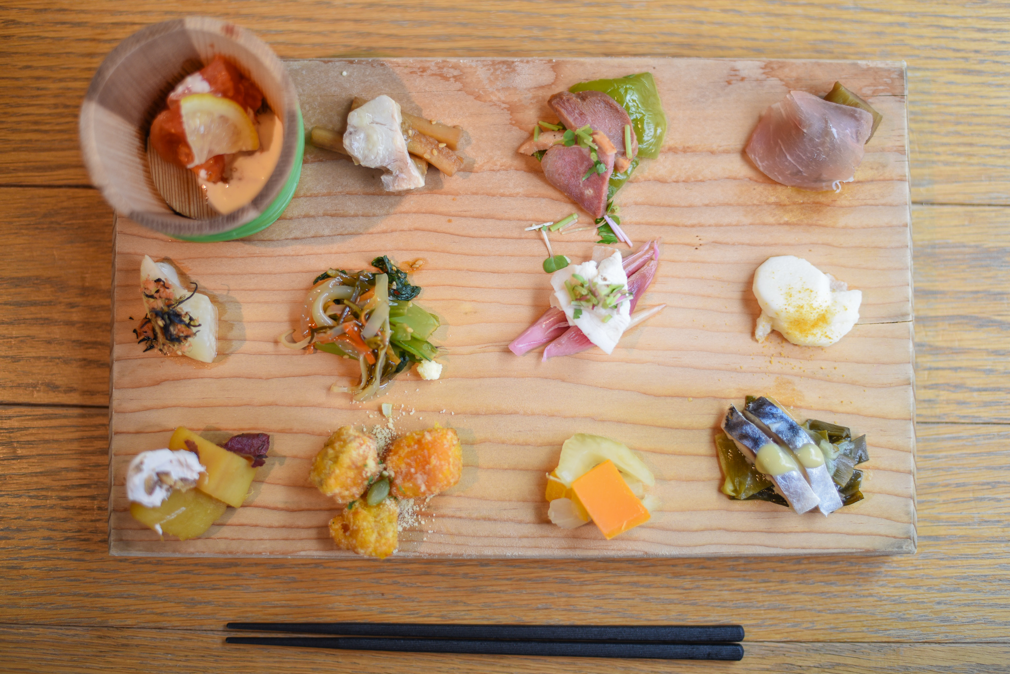 お料理が来るまでの間、フルーツがたっぷり入った2種類のデトックスウォーターと、五穀十葉野菜の番茶をいただきました。こちらは好きなだけいただいていいとのこと!!うれしいお心遣いに、お料理もさらに楽しみになります!ランチメニューは漬け野菜12種盛と季節のスープ、季節の炊き込みご飯のみだそう。わくわく…*