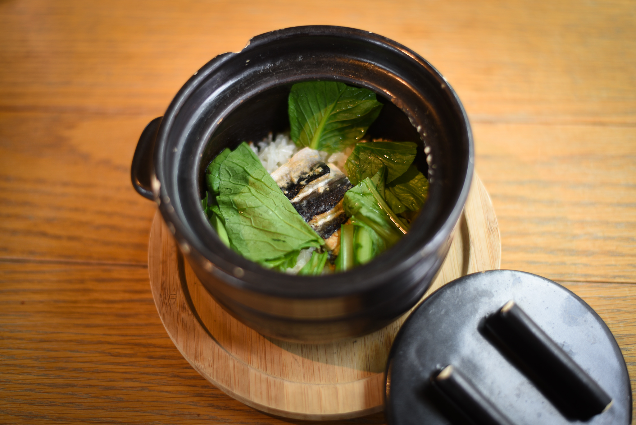 漬け野菜の後に運ばれてきたのが、土鍋に入った釜飯です。今日の釜飯は小松菜とサンマ。蓋を開けるとフワッといい香りが漂います。大好きなおこげも…♡出汁がしっかりしみたご飯に、お箸がどんどん進みます。