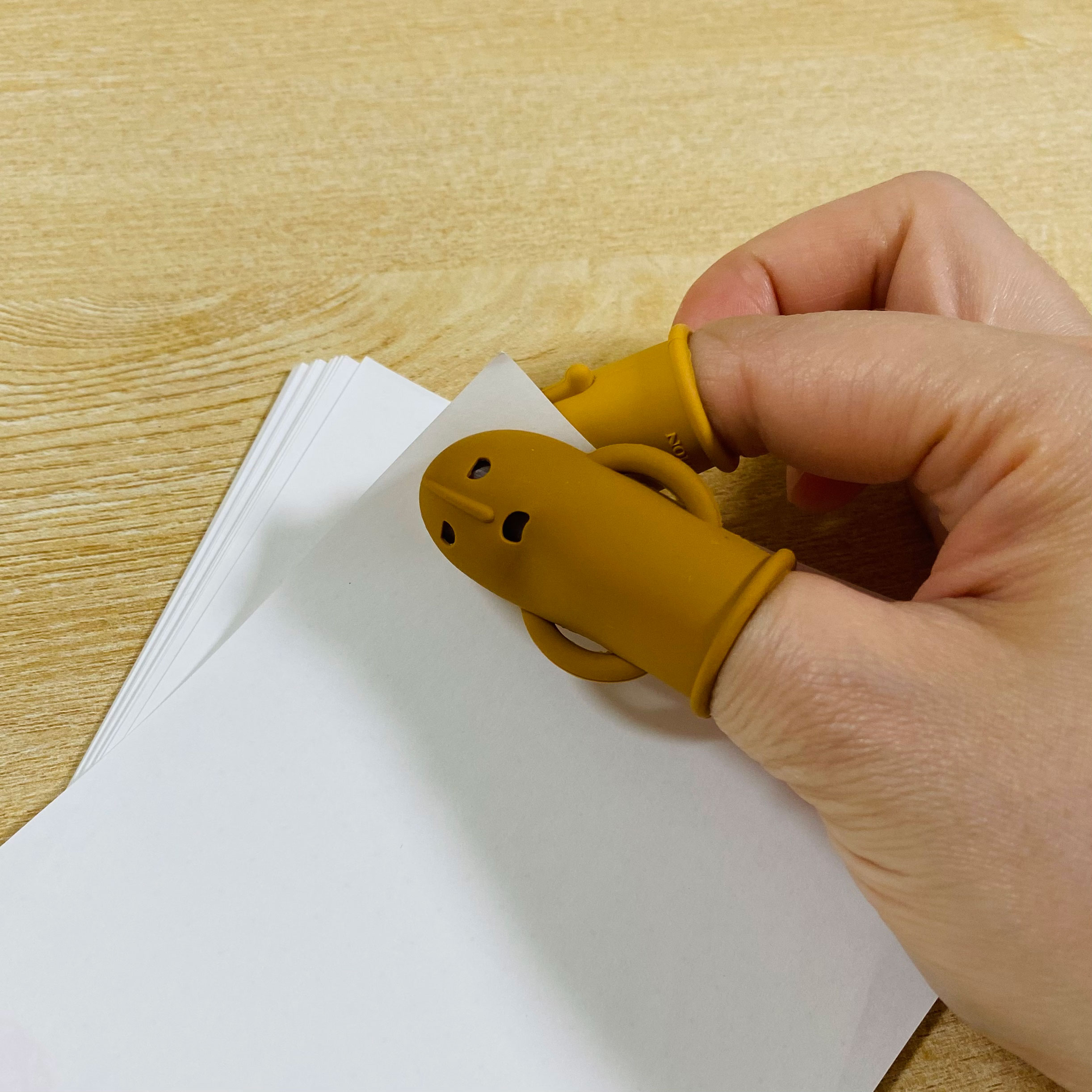紙をたくさんめくる時に役立つ指サック。ただの事務用品…と思っていたら、その形から埴輪を想像して商品化されたのがこの「はにさっく」。引き出しの中にしまうより、机の上に並べたくなってしまうかわいさです!