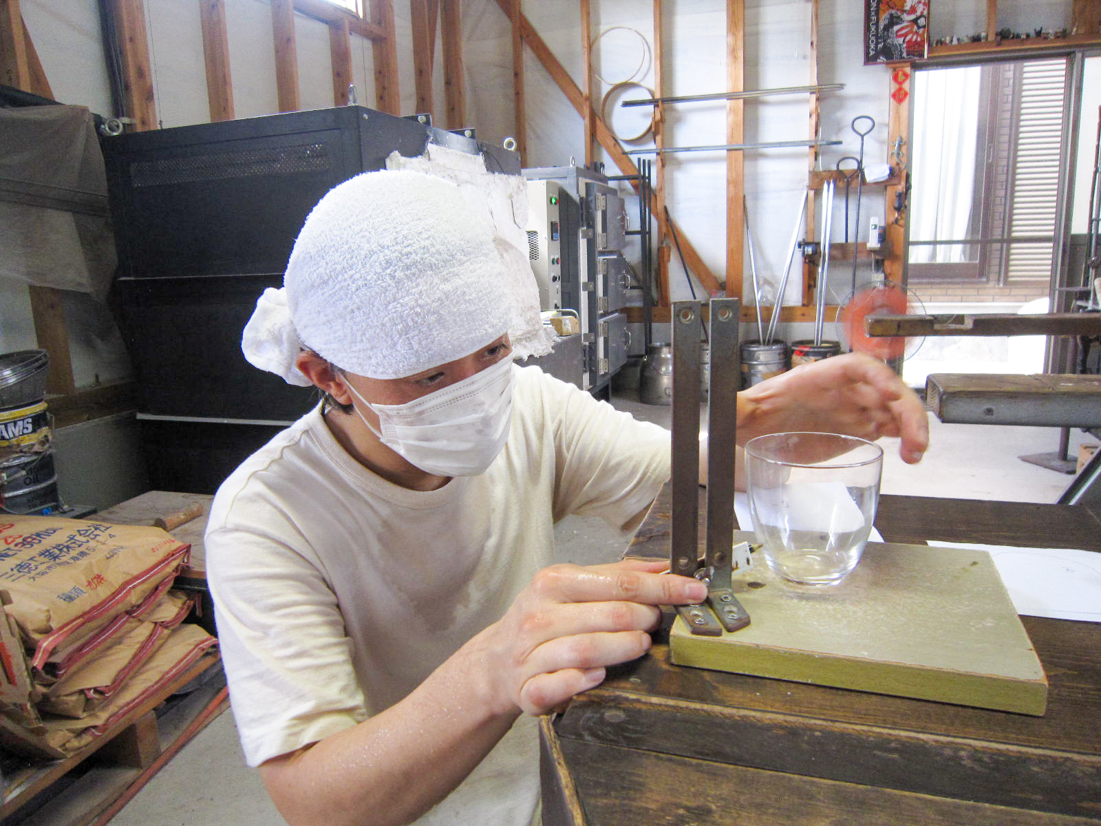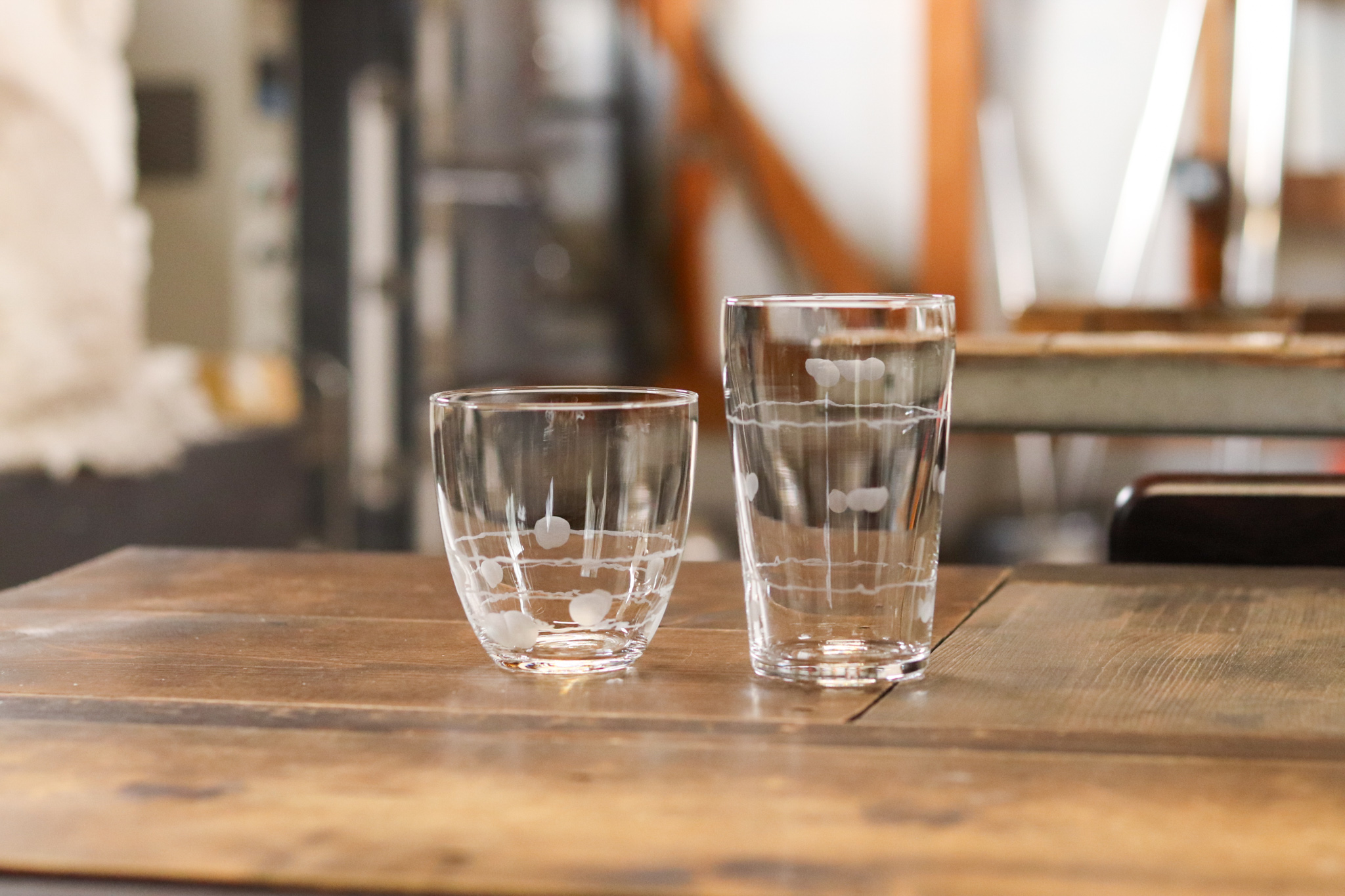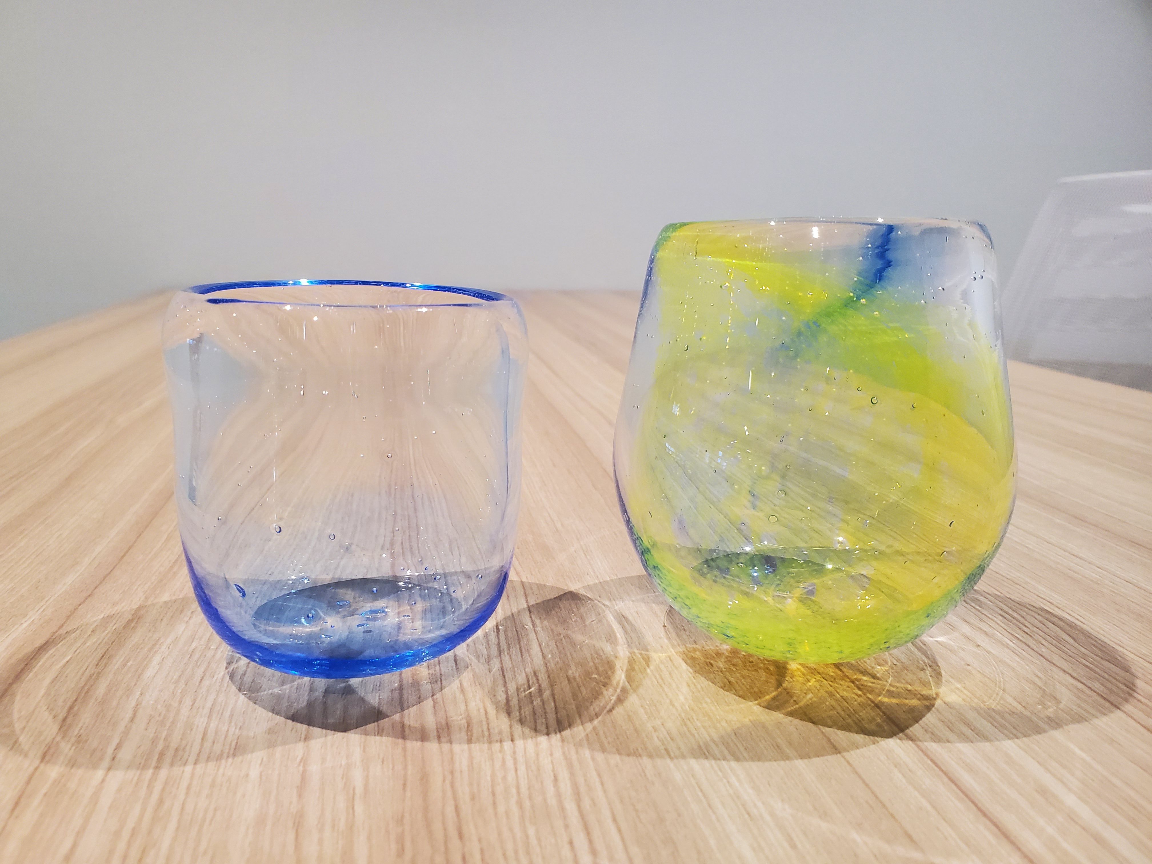 完成!…かな?背の低いグラスが尾中、高いグラスが村上の作品です。結局二人ともまっすぐな線や、きれいな円を描くことができませんでした(^_^;) 改めて、こうした伝統を継承されている職人の方々のすごさを感じます。