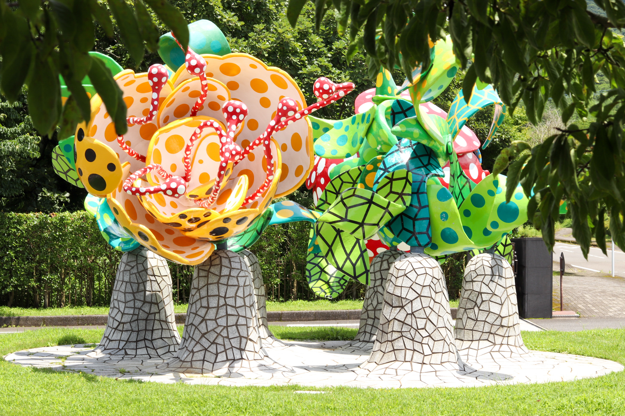 外に出ると、青空の下で色鮮やかに咲く花の作品が。