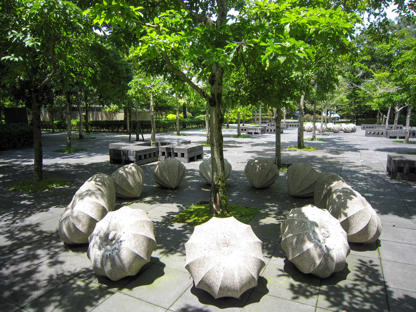 大きなほおずきの実をした石が、規則ただしく並びます。コロンとした姿と等間隔に植えられたこぶしの木。自然と調和したつくりにされたそうです。