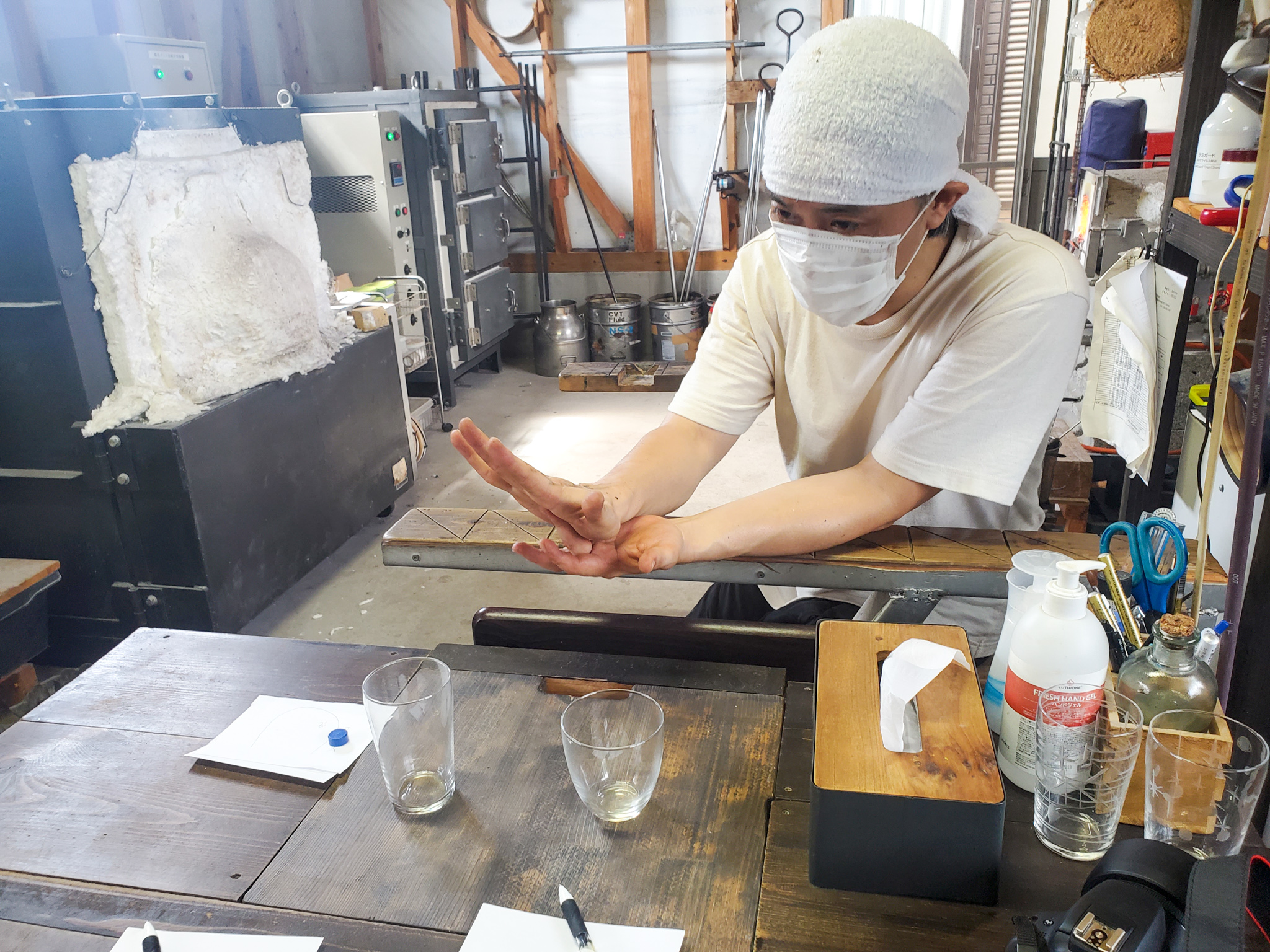 実は… 別にガラスコップづくりも体験しました。熱い窯の中でガラスを溶かして形を整えたり、