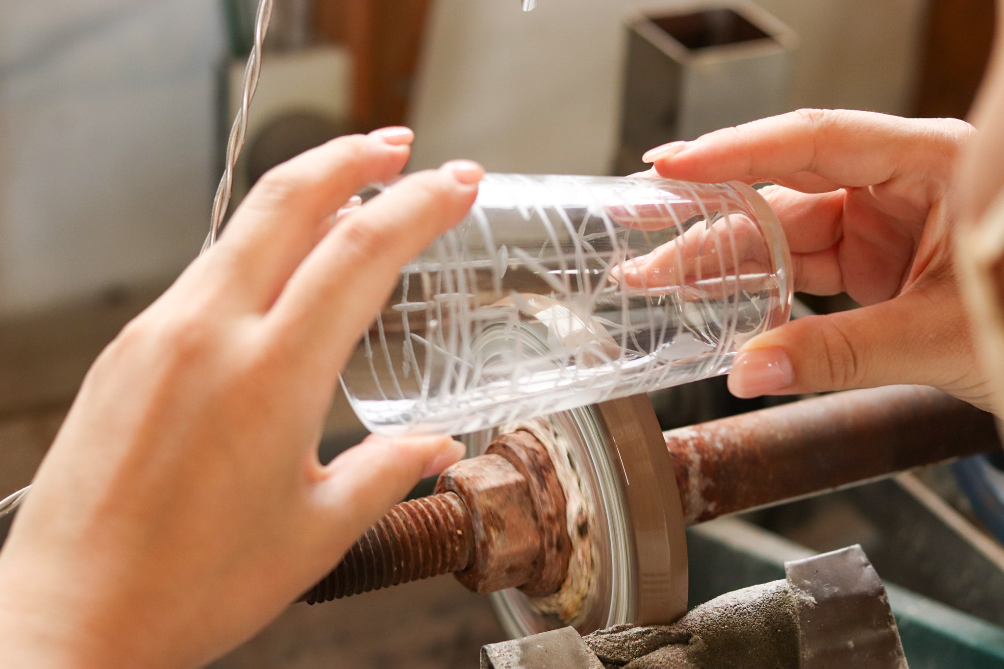 次に向かったのがこっぷ屋さん。 グラスのカット体験ができます。 鹿児島といえば薩摩切子が有名ですが、薩摩切子はとても高価なため、 今回は普通のグラスにカットを入れる体験をさせていただきました。