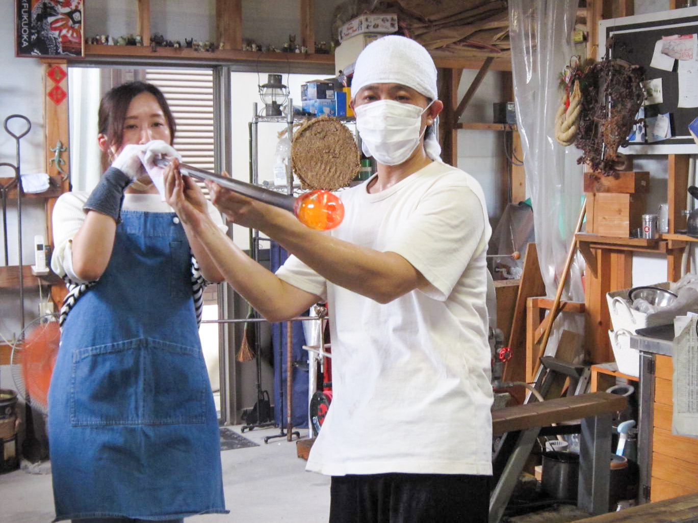 吹いたりまわしたり… 工房は暑くて汗が噴き出ましたが、 素敵なグラスができました♪