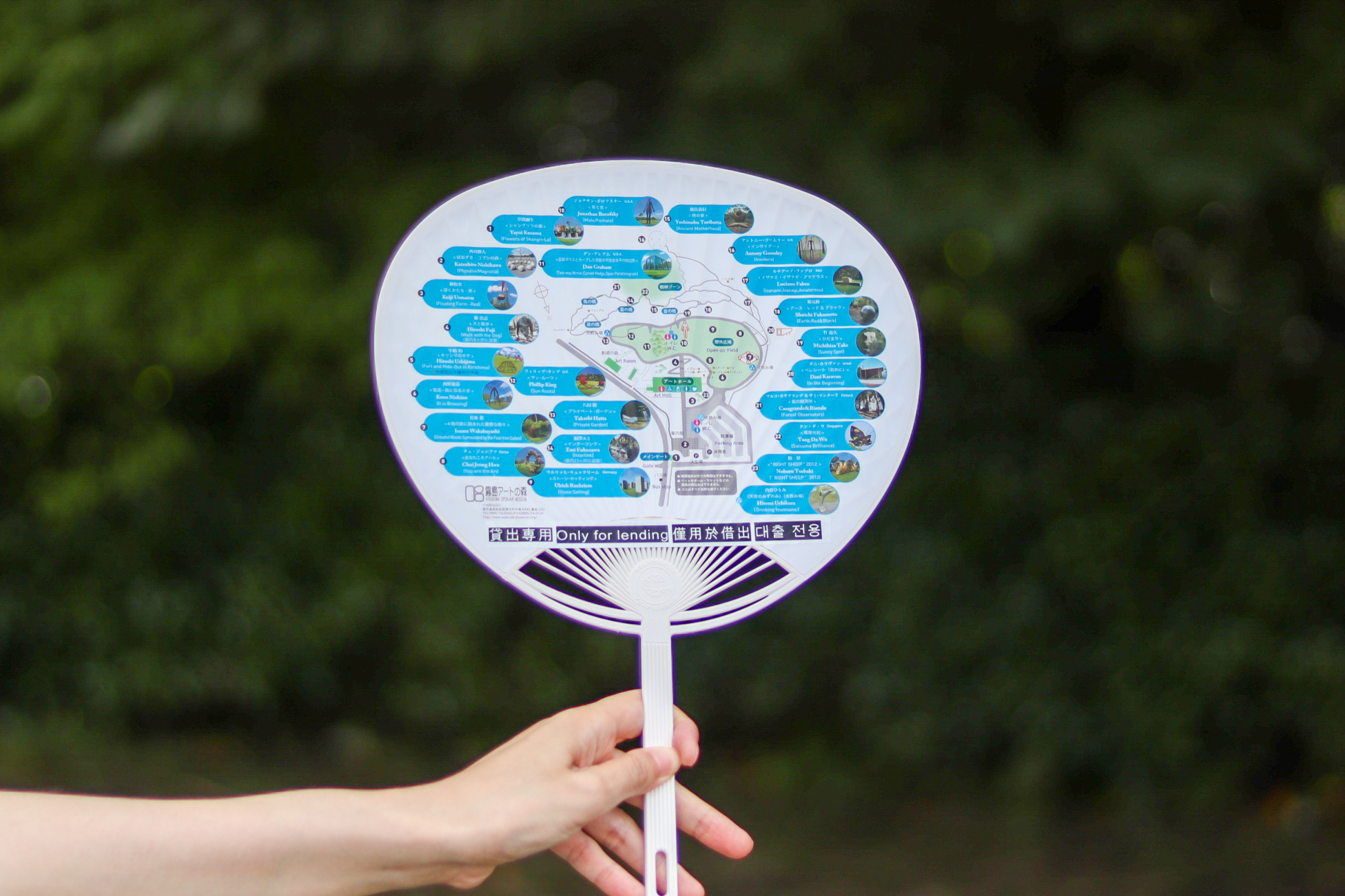 野外展示場の入り口にはうちわが貸し出し中。(夏のみ) うちわに地図が記載されていました♪