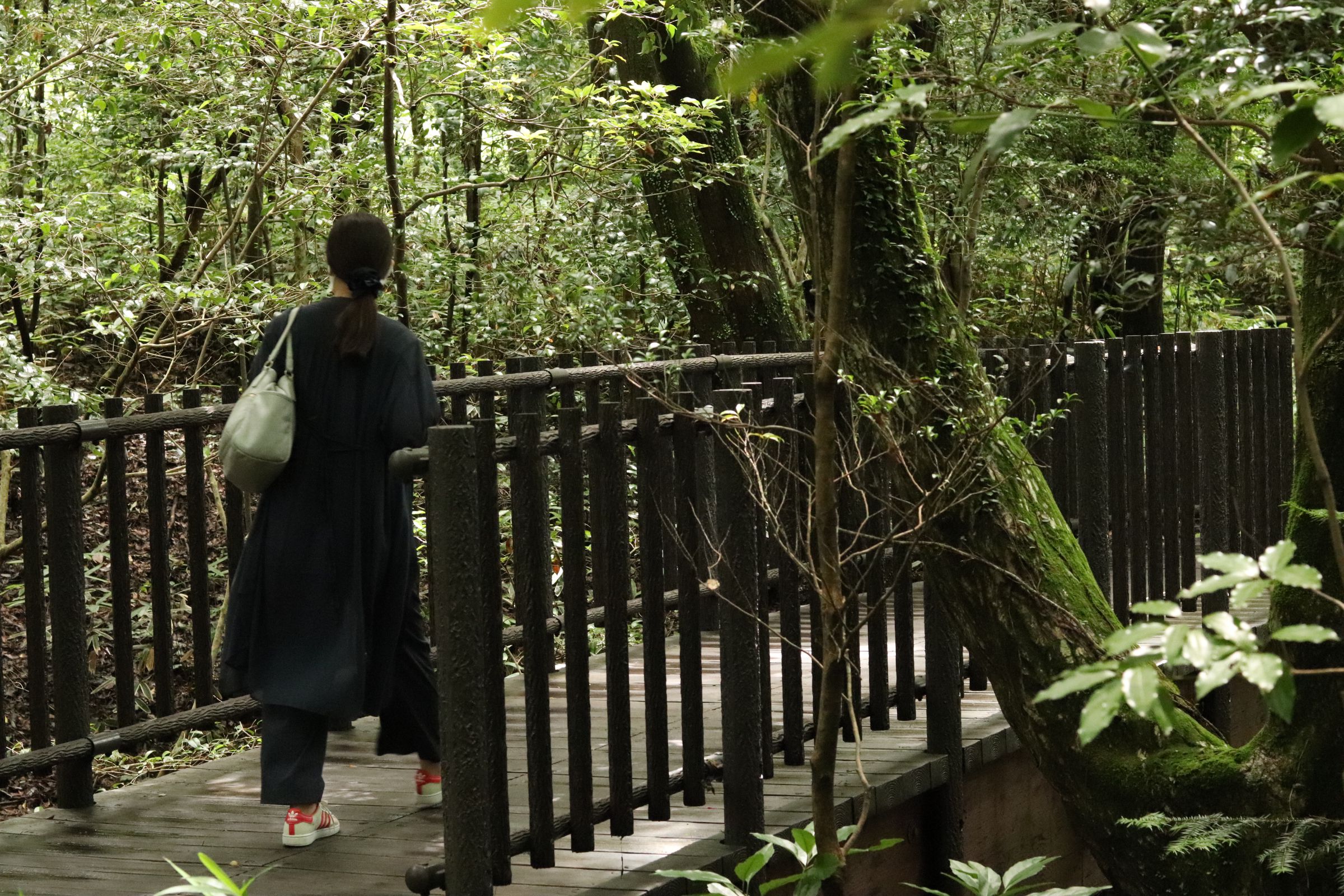 奥までいくと霧島の雄大な大自然が目の前に広がります。暗い中から広がった景色に、スタッフ村上も思わず立ち止まります。トンネルを抜けて別世界に来たかのよう。
