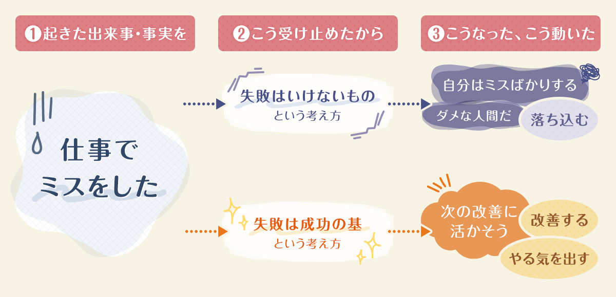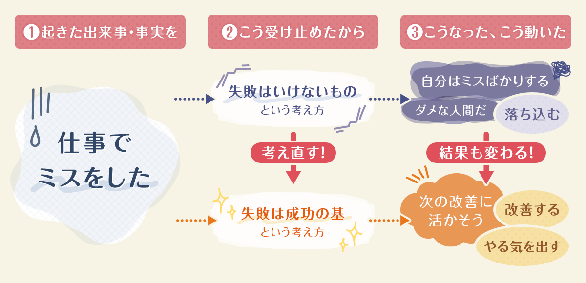 私は個人的には『出来事が悩みを作るのではなく、その出来事に対する自分の考え方・捉え方が悩みを作る』という言葉が端的に心理を表していて、好きです。自分自身の考え方・捉え方は変えられる、それによって結果も良い方向に変わるかもしれないという気持ちになっていただけたら、すごくうれしいです。そう思えた瞬間から幸せに近づくことができると思います。 なお、今回の「考え方・捉え方で結果が変わる」という理論は心理学の世界では「ABC理論」と言われていて、非常に有名です。現代の精神疾患治療のベースにもなっていて、知れば知るほど奥が深い理論です。興味を持った方はぜひ調べてみてくださいね。